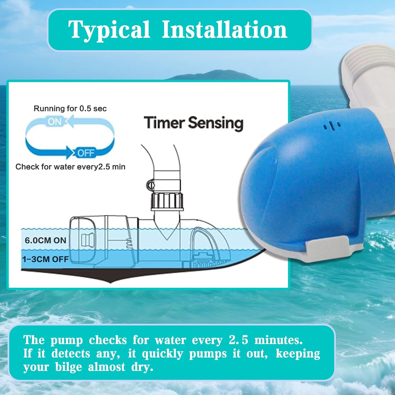 [AUTO SENSING TECHNOLOGY]: Built-in sensors activate the pump when water rises to 2.36inches (60 mm) and shut it off when water drops down to 0.4 inches (10 mm) water levels, leaving the bilge almost completely dry.