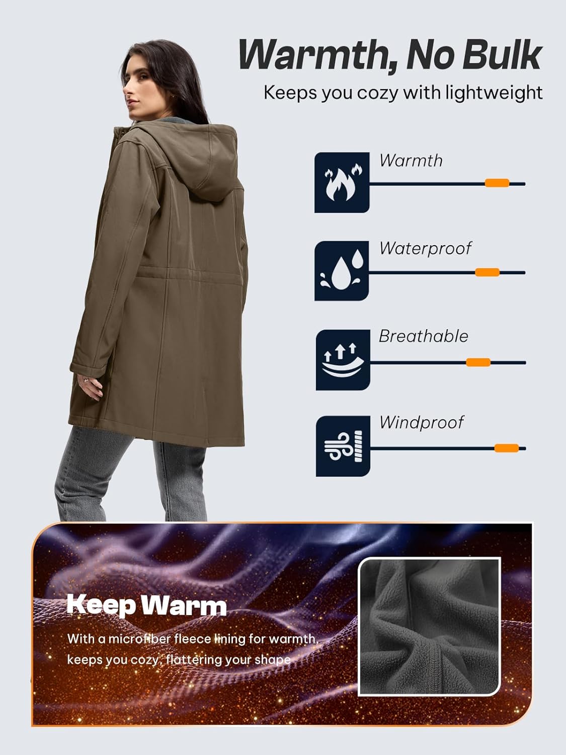 Customers find the rain jacket fits true to size and appreciate its excellent quality, with one noting it provides plenty of room for a sweater underneath. They describe it as comfortable, lightweight, and warm, with one mentioning it’s suitable for mildly cold rainy days. They like the fleece lining, and one customer notes the longer length is wonderful.