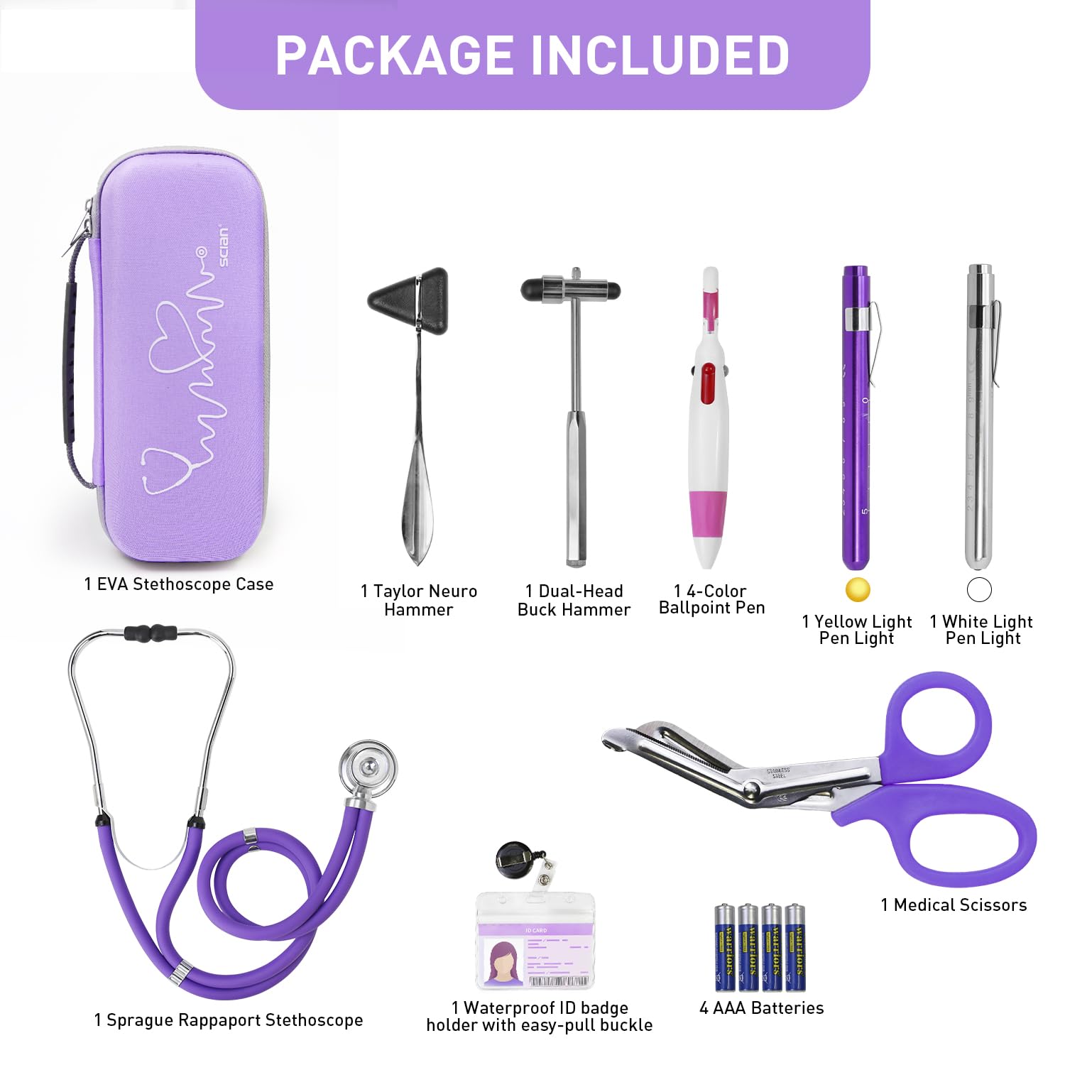 13 Pcs Stethoscope Case with Supplies: Comes with 1 pc purple case, 1 pc stethoscope, 1 pc nurse scissors, 1 pc neuro hammer, 1 pc buck hammer, 2 pc pupil gauge pen lights with two batteries each, 1 pc 4-colored ballpoint pen, 1 pc waterproof ID card holder, which are essential nurse tools and provide everything you need for daily work