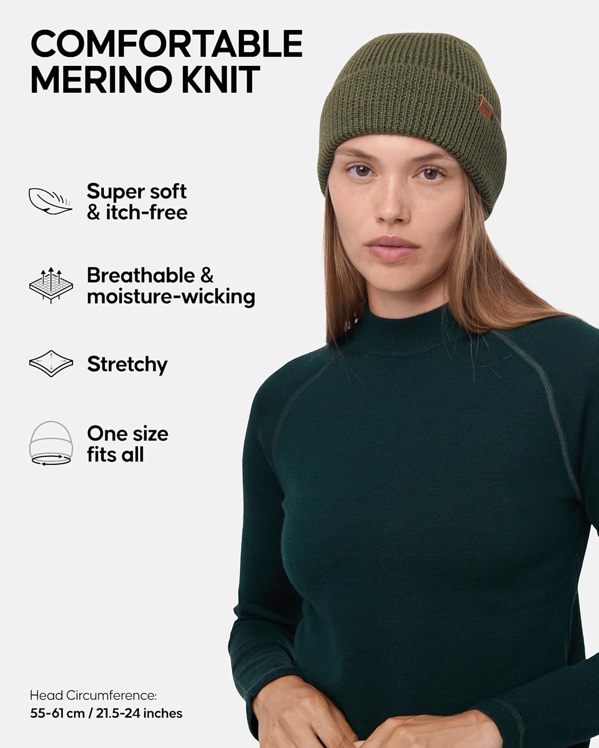 Customers find the beanie keeps their head warm down to about 50 degrees, is well-made, and doesn’t irritate or itch. The hat fits well, is soft, and has a good-looking appearance, while being light and not overly bulky. The material quality receives mixed feedback, with some customers loving the material while others note it’s not 100% Merino Wool.
