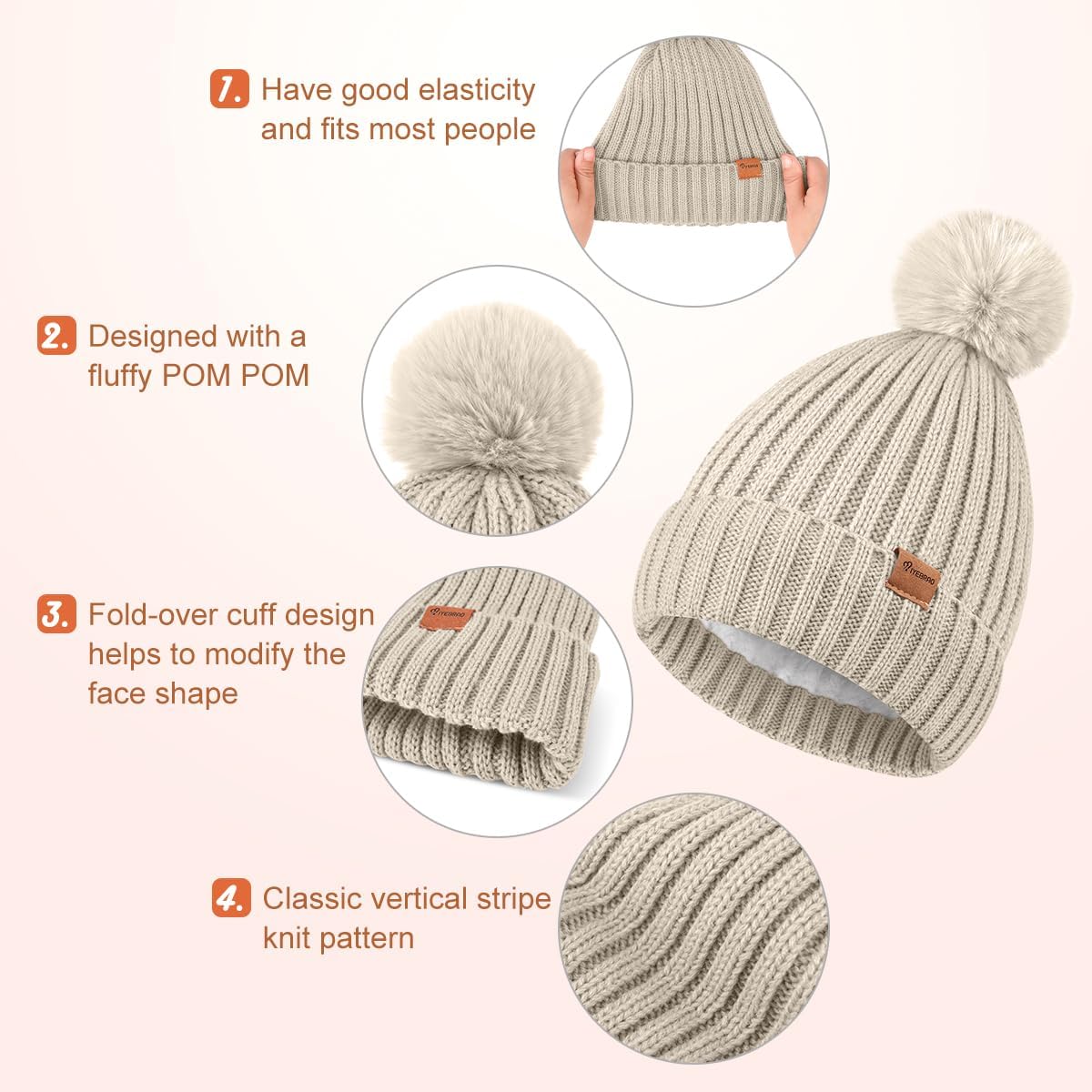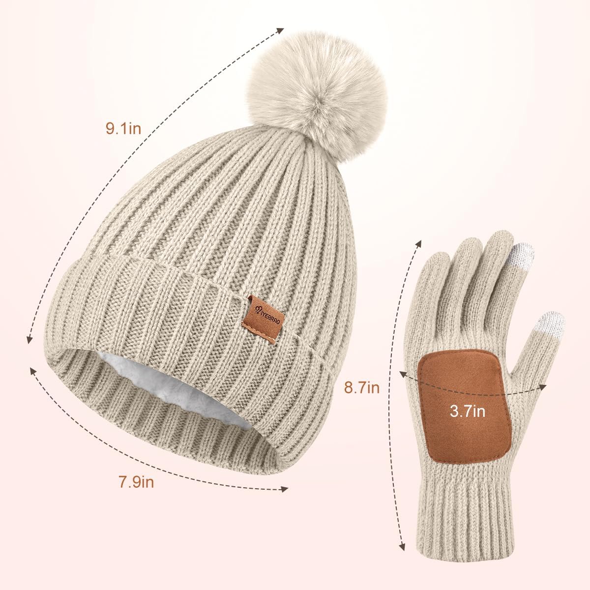 Womens Beanie Hat Gloves Set Winter Knitted Beanie Hat for Women With Pom Pom Warm Touchscreen Gloves Set for Cold Weather