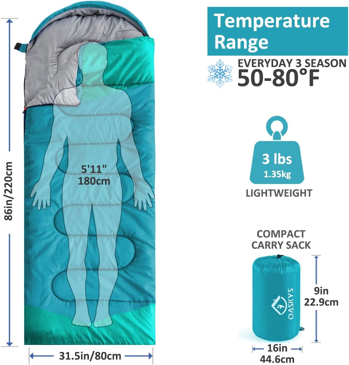 SIZE&EASY TO CARRY:(190 + 30)cm x 75 cm.Can be wiped clean making it versatile and convenient. Each sleeping bag comes with a compression sack with straps, allowing for super convenient storage and easy carry maneuverability