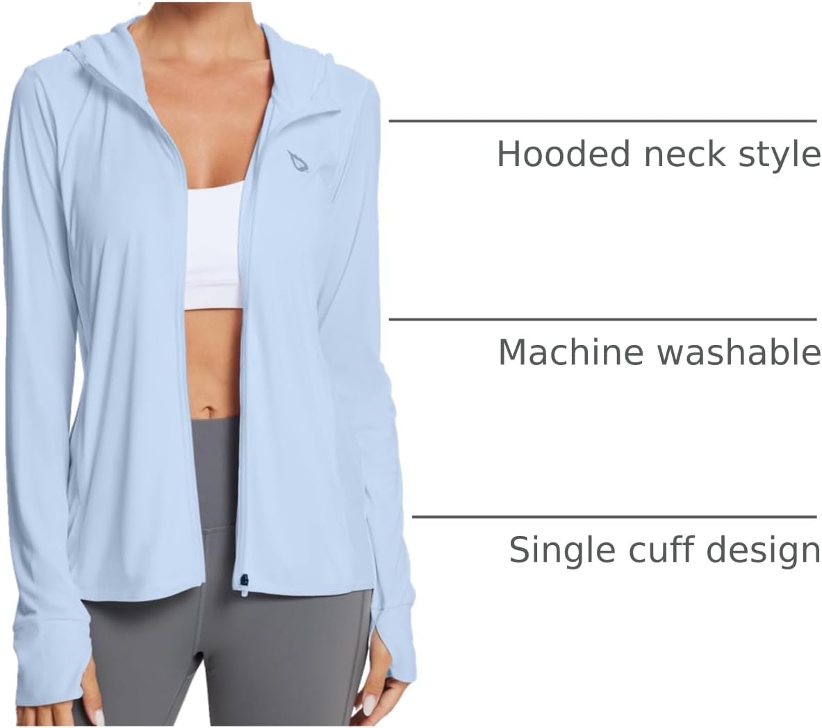 Customers find this sun protection jacket lightweight and comfortable, with sleeves that are a good length and don’t cause overheating. They appreciate its bright pink color for visibility, smooth silky feel, and how it keeps them cool even when wet. The jacket provides excellent sun protection, with the hood effectively shielding the face and neck, and one customer mentions it works well for hiking.