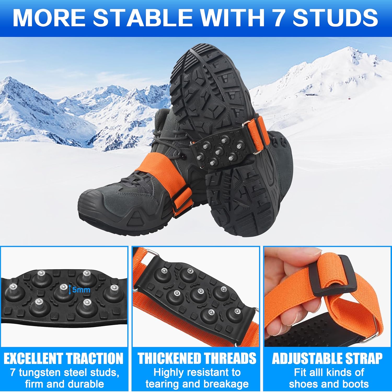 【FORCEFUL GRIP】Crampons snow cleats feature 7 tungsten studs, provide excellent footing and traction on a wide variety of ice, snow, or other terrains. Keep you safe and injury-free