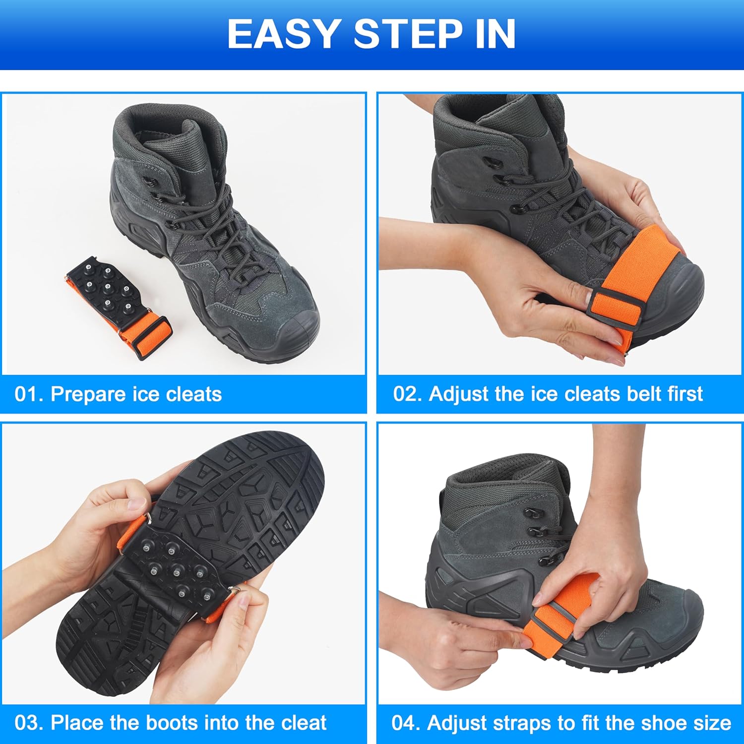 OROOTL Ice Cleats have aggressive traction, excellent toughness and high strength. Used on angled terrain, ice roads, icy driveway, cement and wet grass, etc. These ice cleats crampons will give you the confidence to walk, hike and even run on ice and snow without fear of slipping, sliding or falling. Wearing your favorite boots and never let ice and snow conditions slow you down again!!