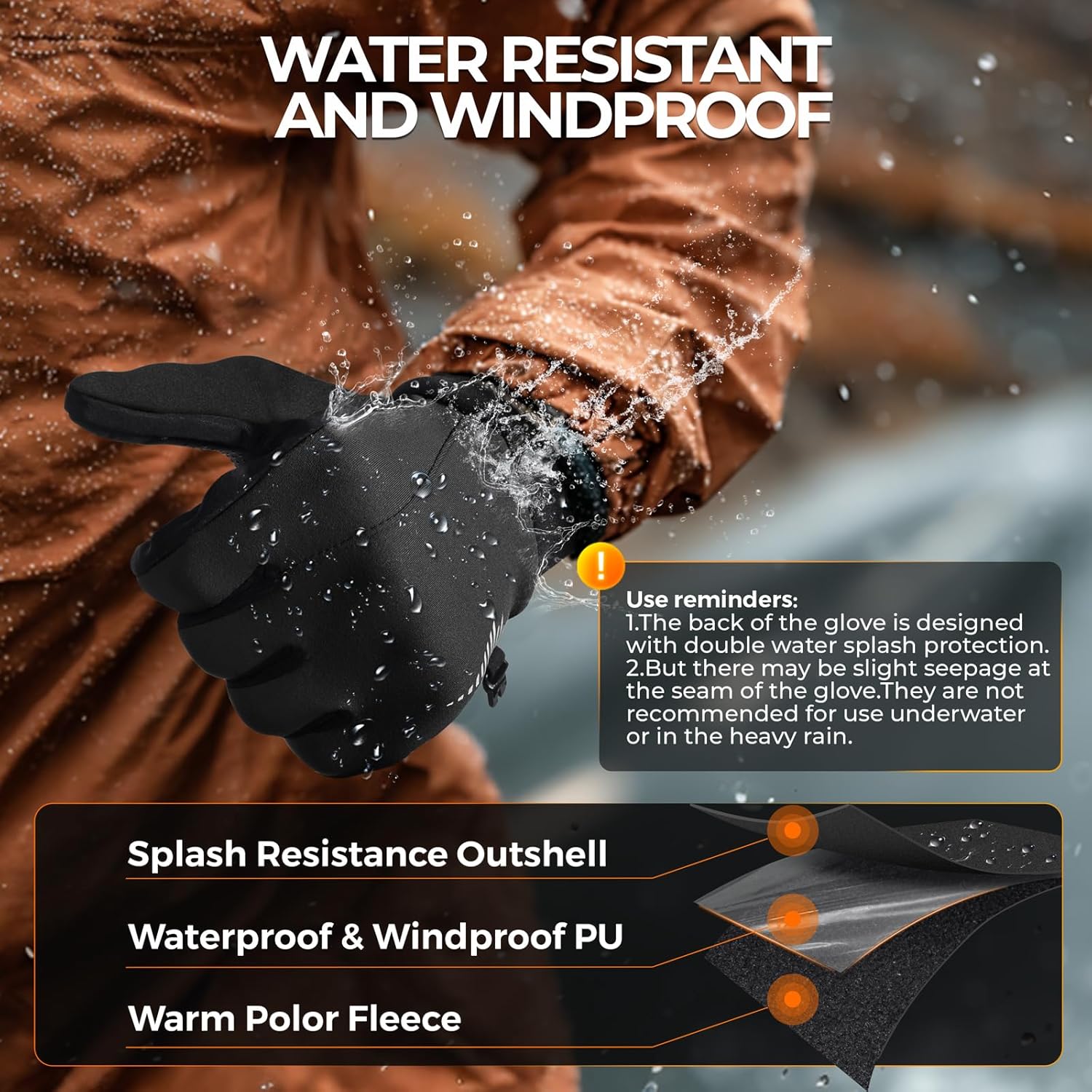 Windproof and Water-resistant: Our winter thermal gloves feature a polyester shell with a high-density water-resistant coating on the surface, plus an additional water-resistant and windproof PU layer between the lining and shell. Whether biking, hiking, or commuting to work, your hands stay warm and dry. Friendly reminder: Not recommended for use underwater or in heavy rain, as minor water seepage may occur at the stitching.