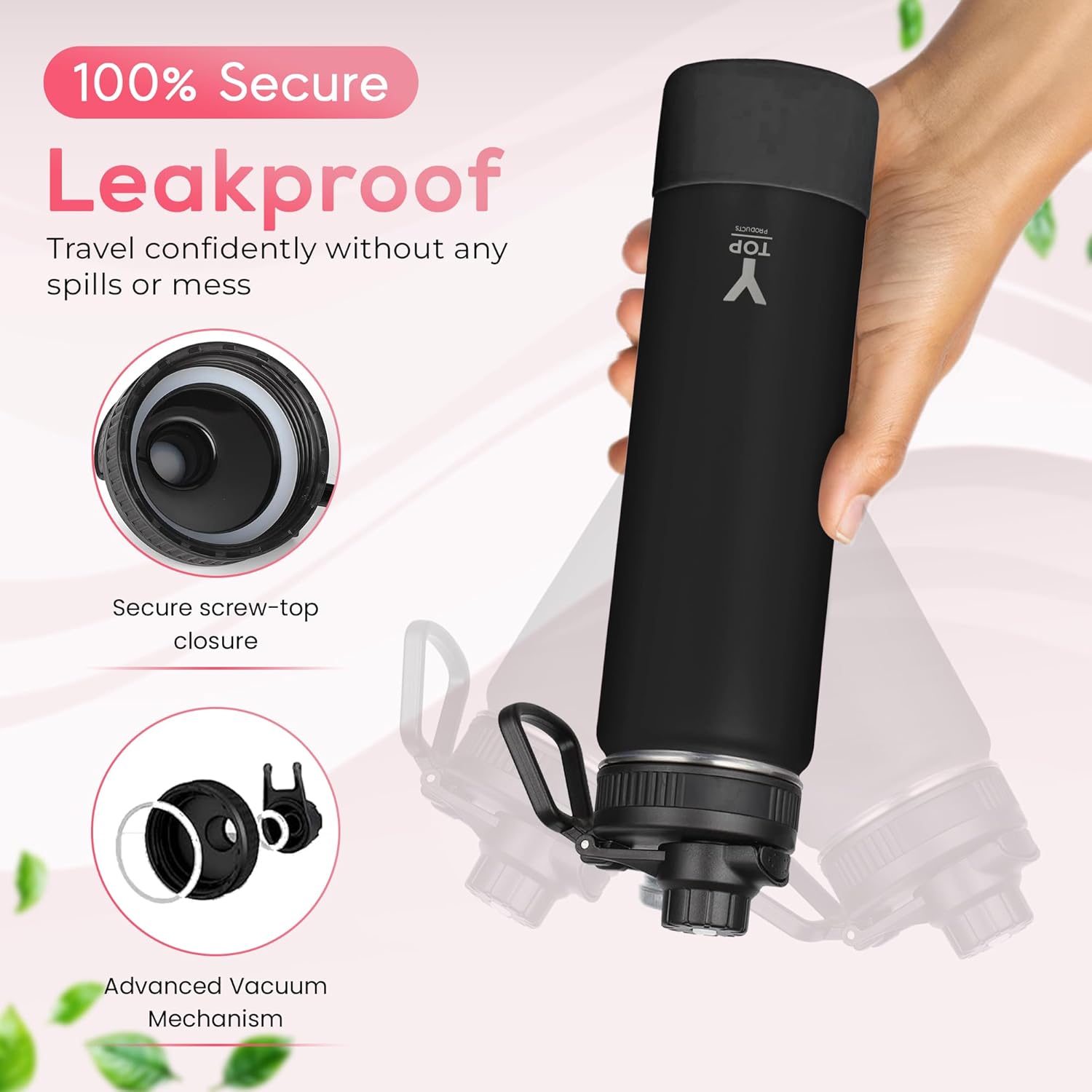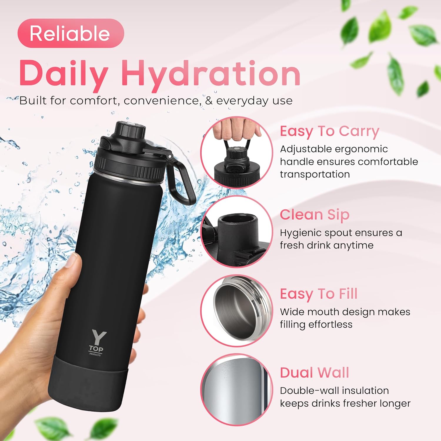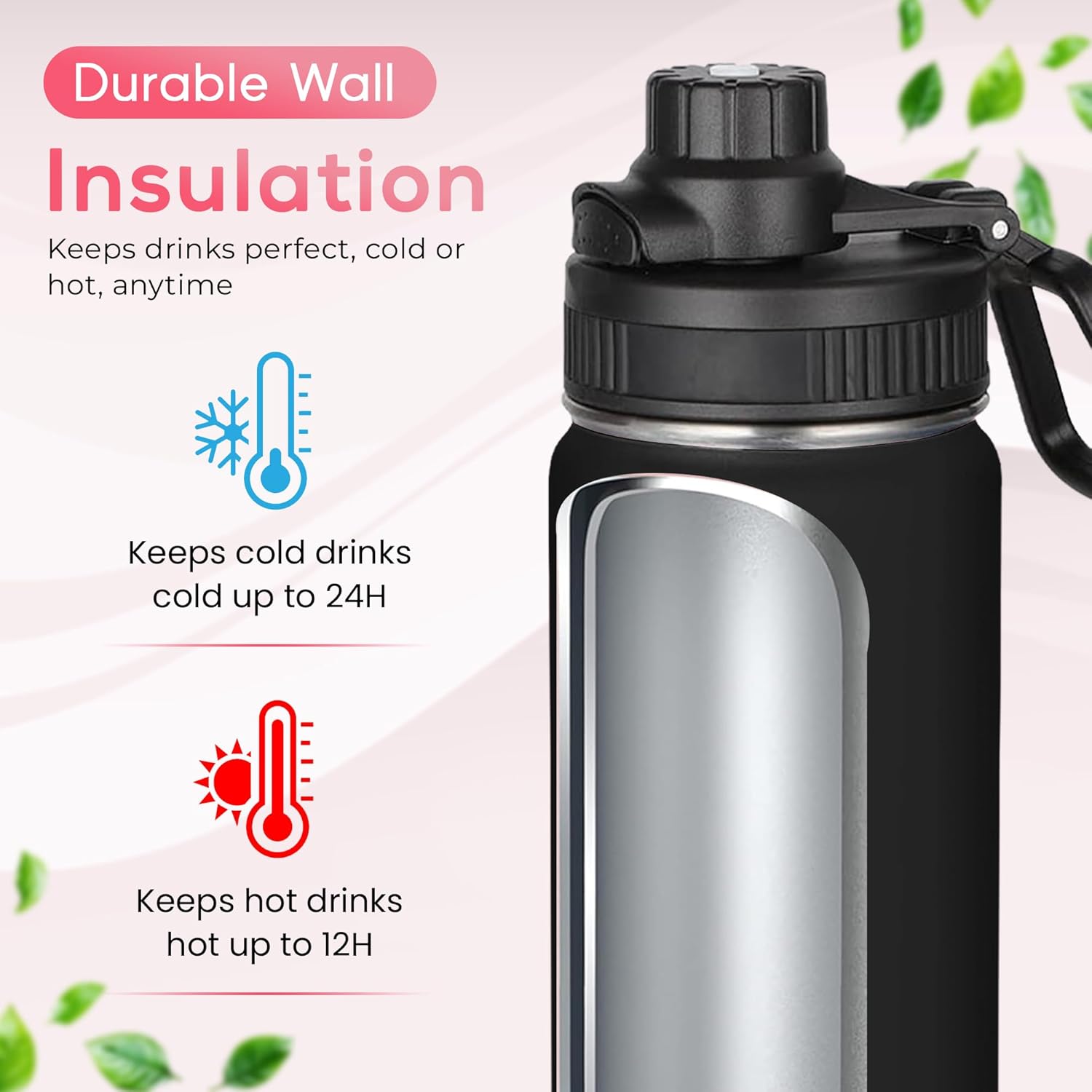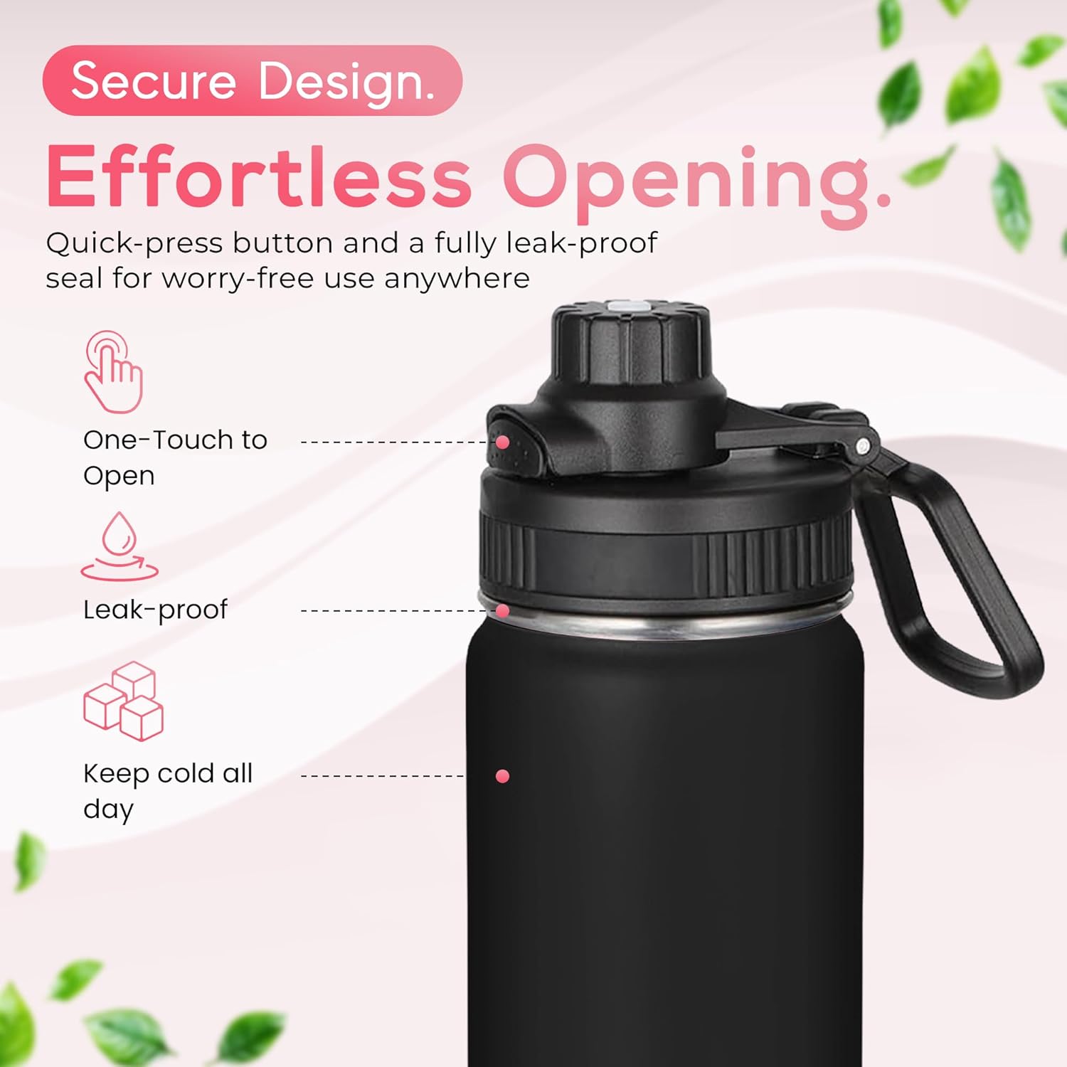 NO SPILL, NO LEAK, NO STRAW: Unlike stainless steel insulated water bottles with straws that leak, our 24oz insulated water bottle features a leak-resistant sipping spout. Toss the insulated stainless steel water bottle in a backpack, diaper bag, handbag or carry-on luggage with ZERO worries of leakage or spillage. Your drink stays put, your bag stays dry, you stay hydrated on the go! Great non leak water bottle for traveling, backpacking, biking, cycling and outdoor activities.