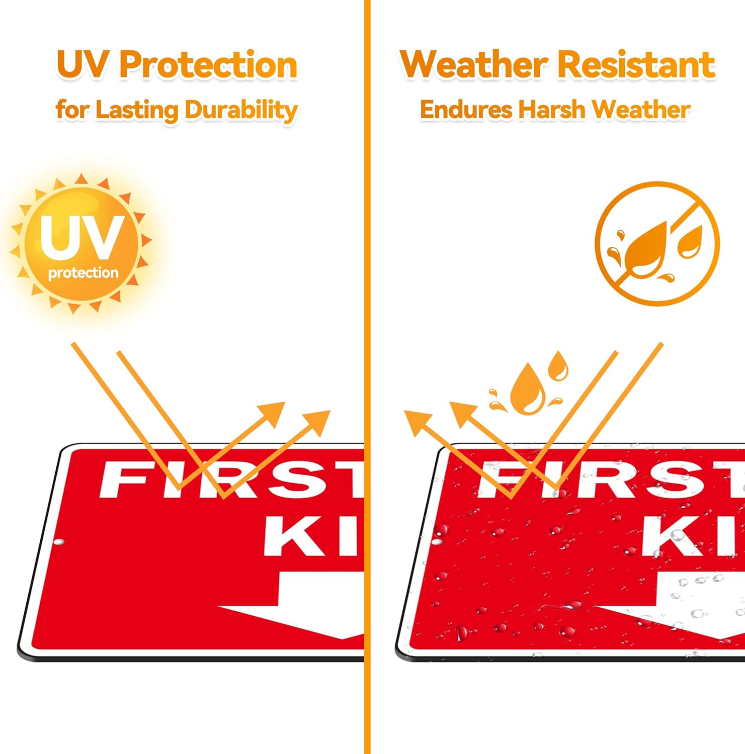 3. HEAVY DUTY METAL SIGN: Our first aid kit sign is made from 47 mil (1.2 mm) thick solid aluminum. It’s waterproof and resistant to bending and scratching. The durable metal with UV printing is built to withstand sun, rain, heat, and cold for years. Suitable for both indoor and outdoor use. Our metal sign is much more durable than plastic or acrylic signs, which are prone to bending or breaking.