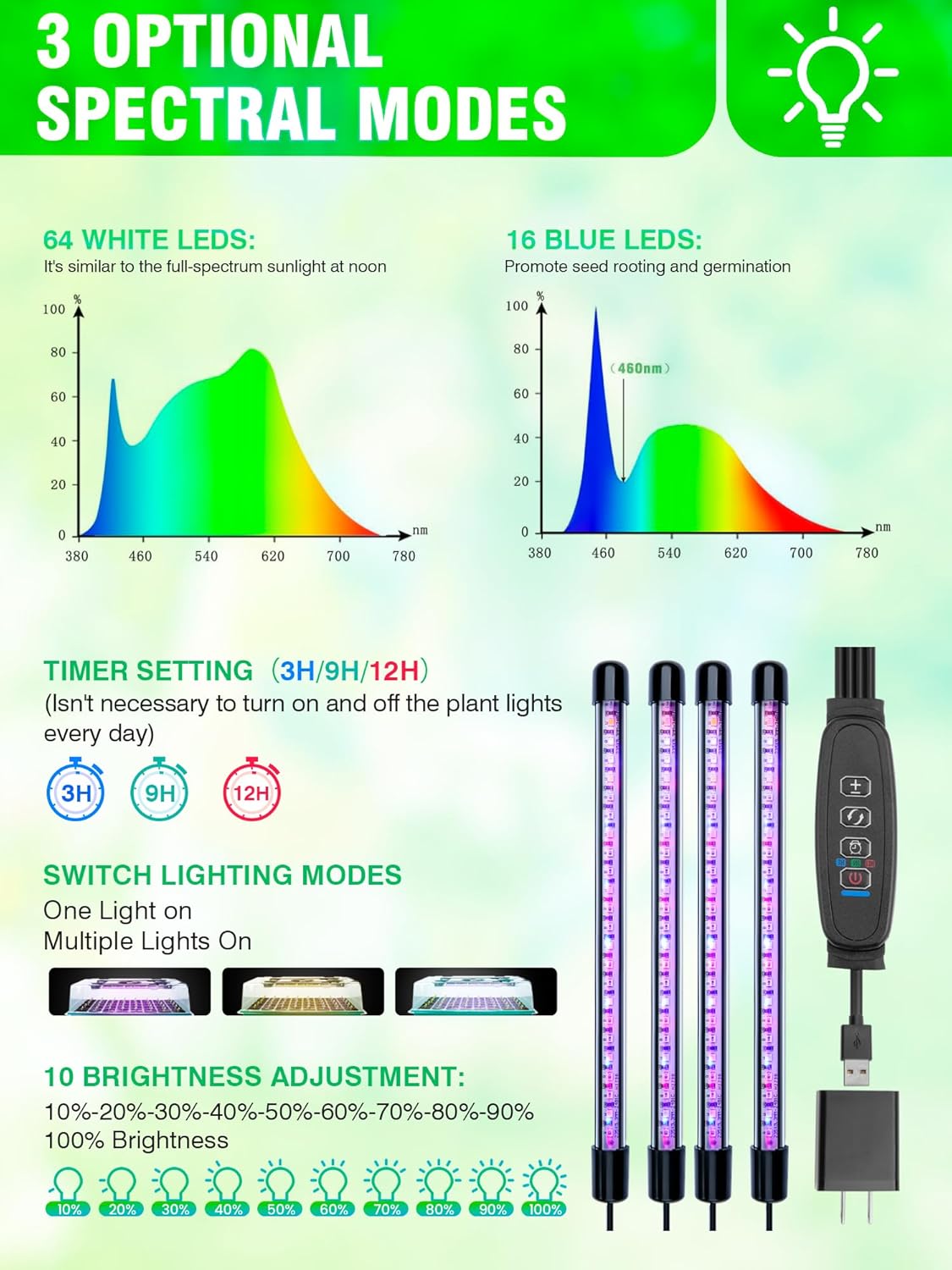 EMBEDDED ADJUSTABLE LED PLANT GROW LIGHT: Equipped with 48 high-efficiency beads per seedling tray, these LED strips simulate natural sunlight for optimal seedling growth. With adjustable brightness and timer functions, it meets the light conditions your plants need most at different stages, promoting faster, healthier growth.