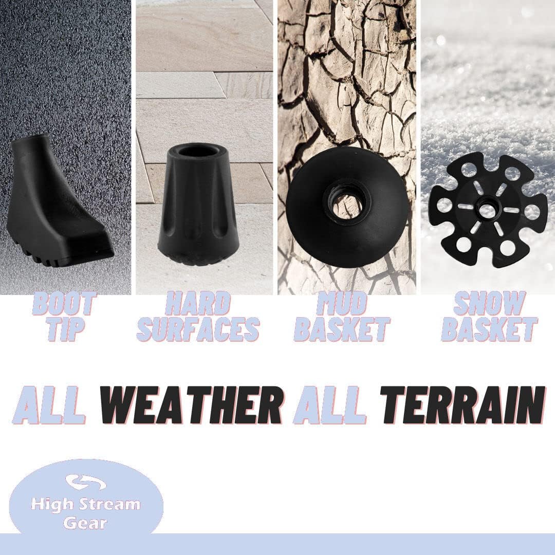 KEEPS YOUR HANDS BLISTERS FREE – High Stream Gear’s Walking sticks for women and men are made with ergonomically designed handles that offer you a firm but comfortable grip. The handles will keep your hands dry.