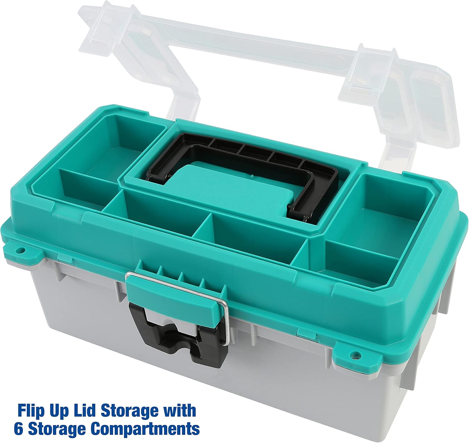 Dual-Layer Organization: Small tackle box features a flip-up lid with six compartments and a lift-out tackle box organizer with eight sections, plus a large lower storage area to keep fishing accessories or hand tools neatly separated.