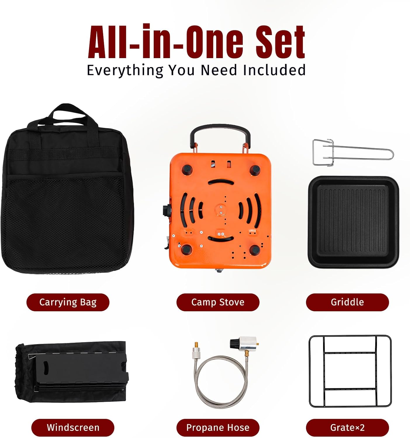 Complete Outdoor Cook Kit: Everything you need in one pack—dual-burner gas stove, two removable grates, non-stick griddle, fold-flat wind guard, propane hose, and carrying bag. Whether you’re camping or emergencies, you can set up a full outdoor kitchen in under a minute. All stainless-steel surfaces wipe clean in seconds after the meal