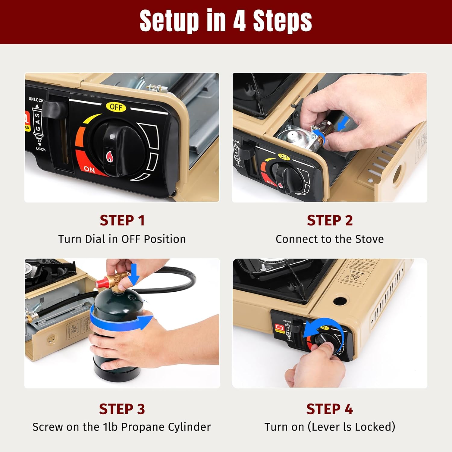 Dual Fuel Design: Works efficiently with both 8 oz. butane canisters and 1lb propane tanks (Note: Fuel is not included). Come with stove windscreen and adapter hose to meet all your fuel needs