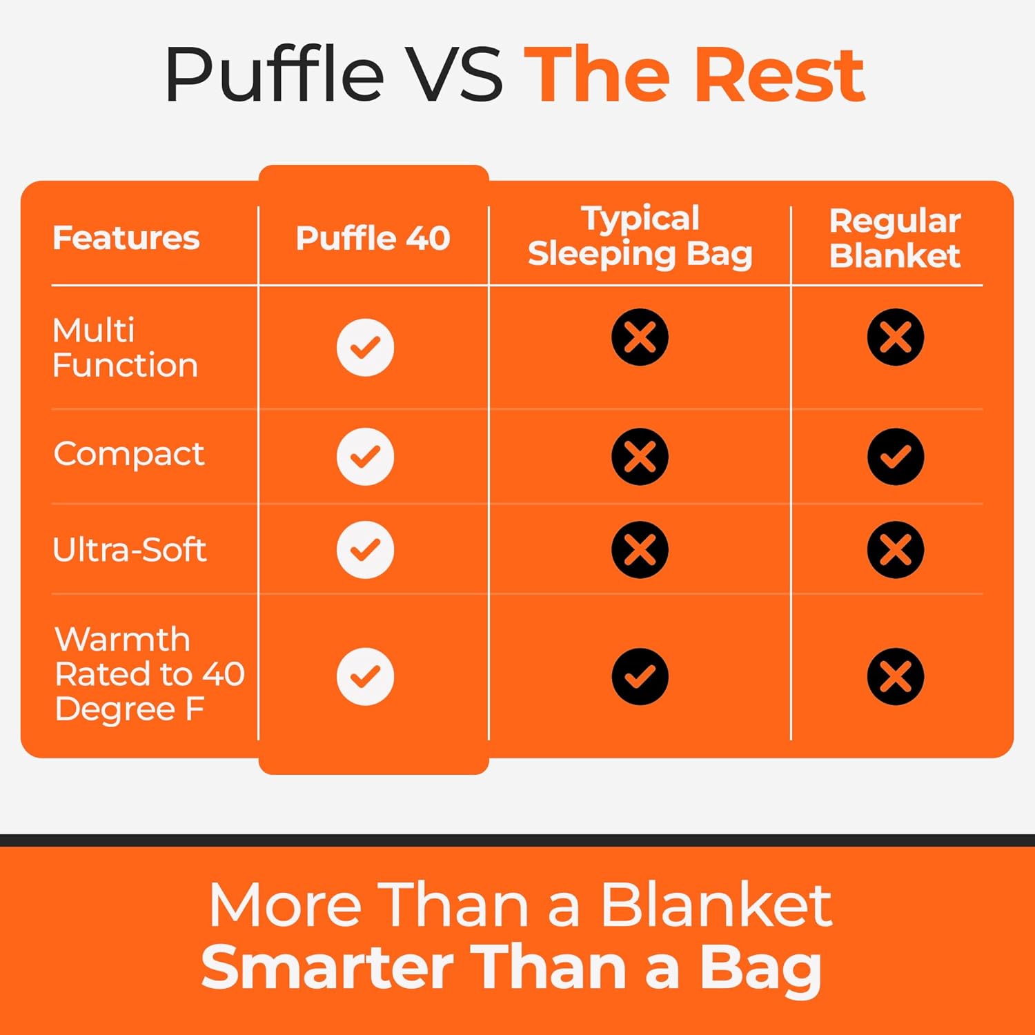 CUSTOMIZABLE COMFORT FOR ANY SLEEP STYLE: Engineered to adapt, this versatile camping blanket can be snapped together with another Puffle for couples, stacked for extreme cold, cinched at the footbox for sleeping bag mode, or laid flat for lounging. A true packable camping blanket built for solo adventurers, hammock campers, and families alike.