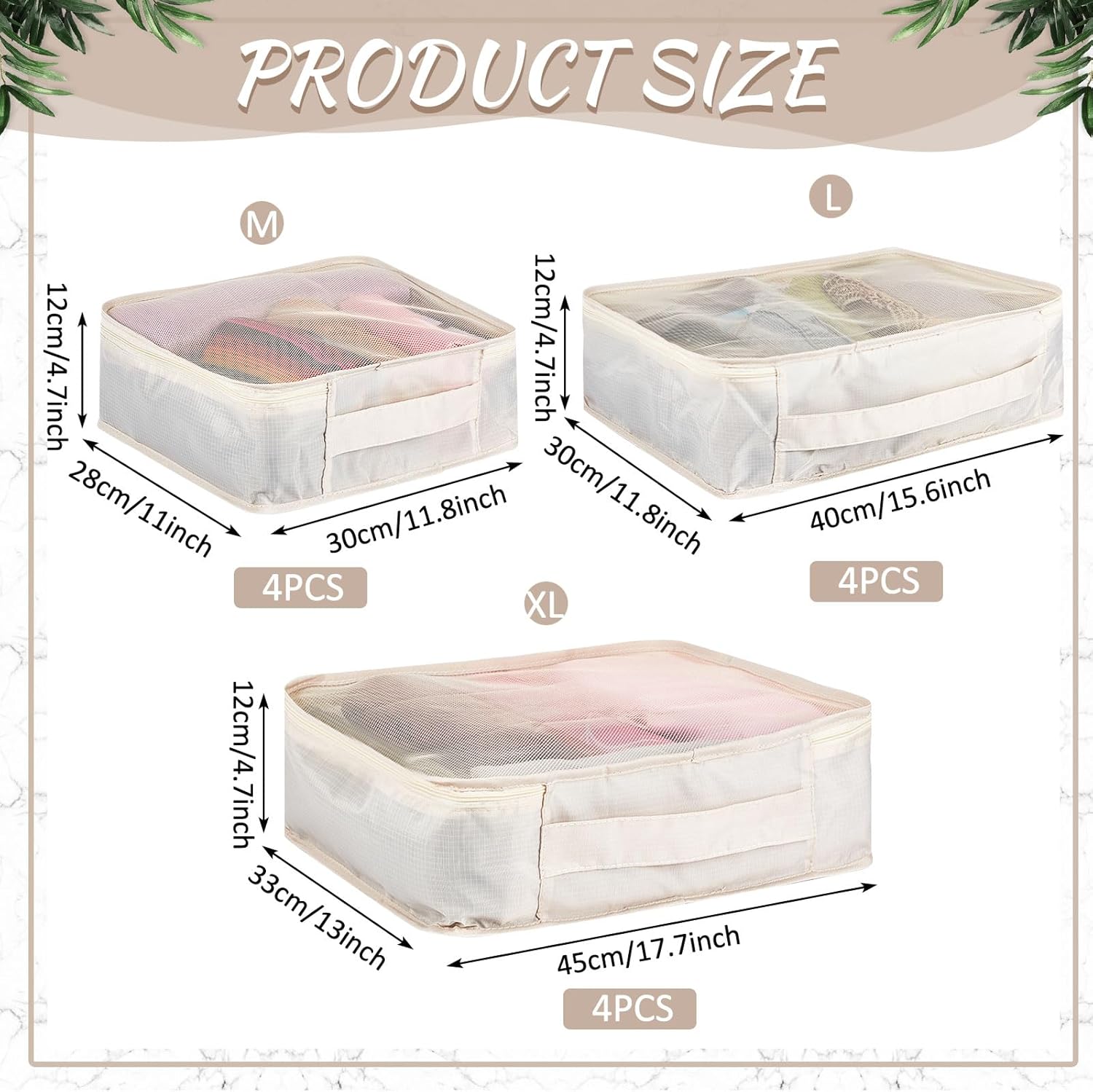 Meet Your Daily Needs: you will receive 12 pieces of luggage organizers for suitcase, including 4 pieces of extra large size bags (17.7 x 13 x 4.7 inches/ 45 x 33 x 12 cm), 4 pieces of large bags (15.8 x 11.8 x 4.7 inches/ 40 x 30 x 12 cm) and 4 pieces of medium bags (11.8 x 11 x 4.7 inches/ 30 x 28 x 12 cm); One set can meet your daily luggage packing need