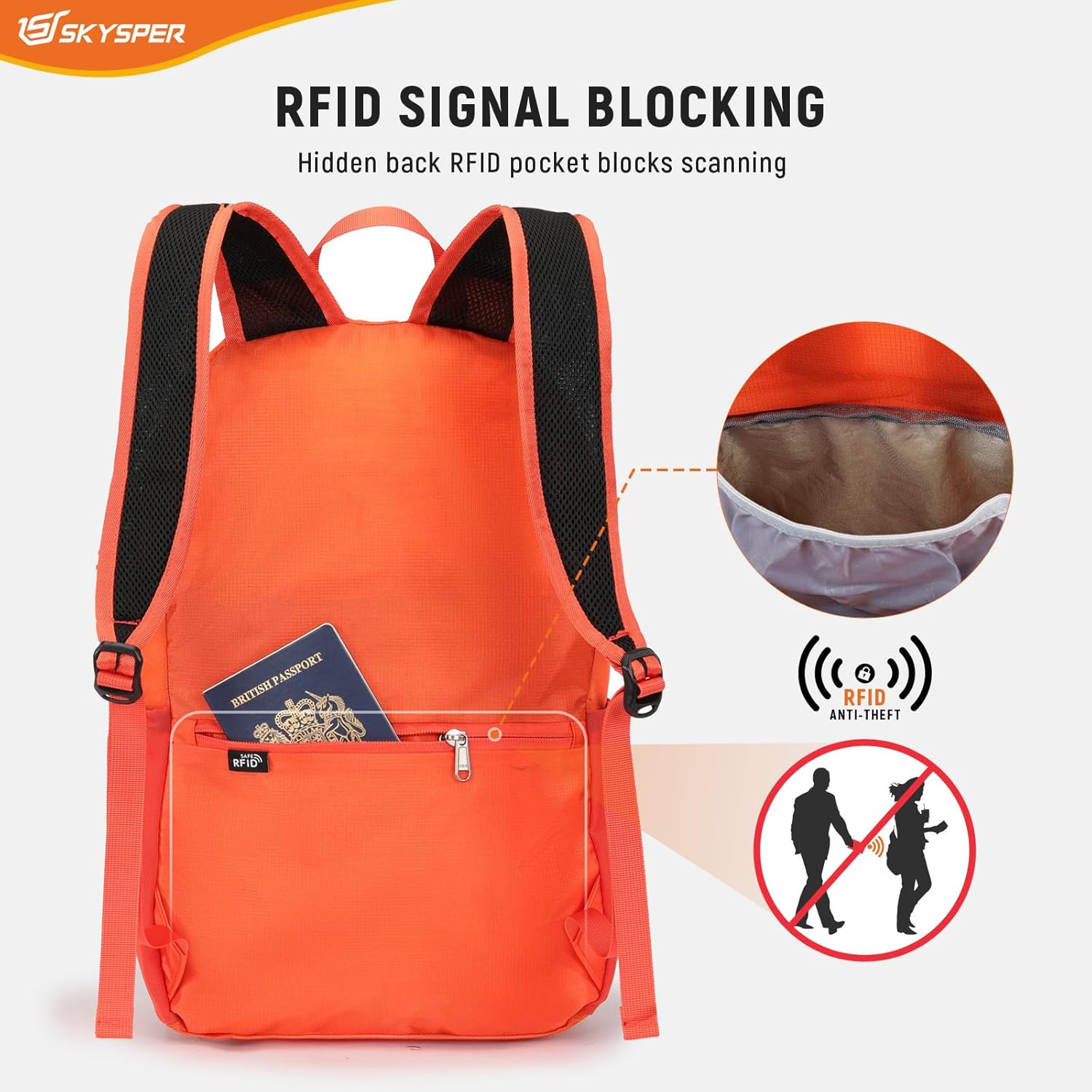 Dual Anti-Theft Protection: This packable backpack features a hidden back pocket and RFID blocking technology, ensuring the safe storage of passports, wallets, phones or credit cards while preventing them from being scanned or copied. Dual protection allows you to travel with peace of mind and enjoy your journey