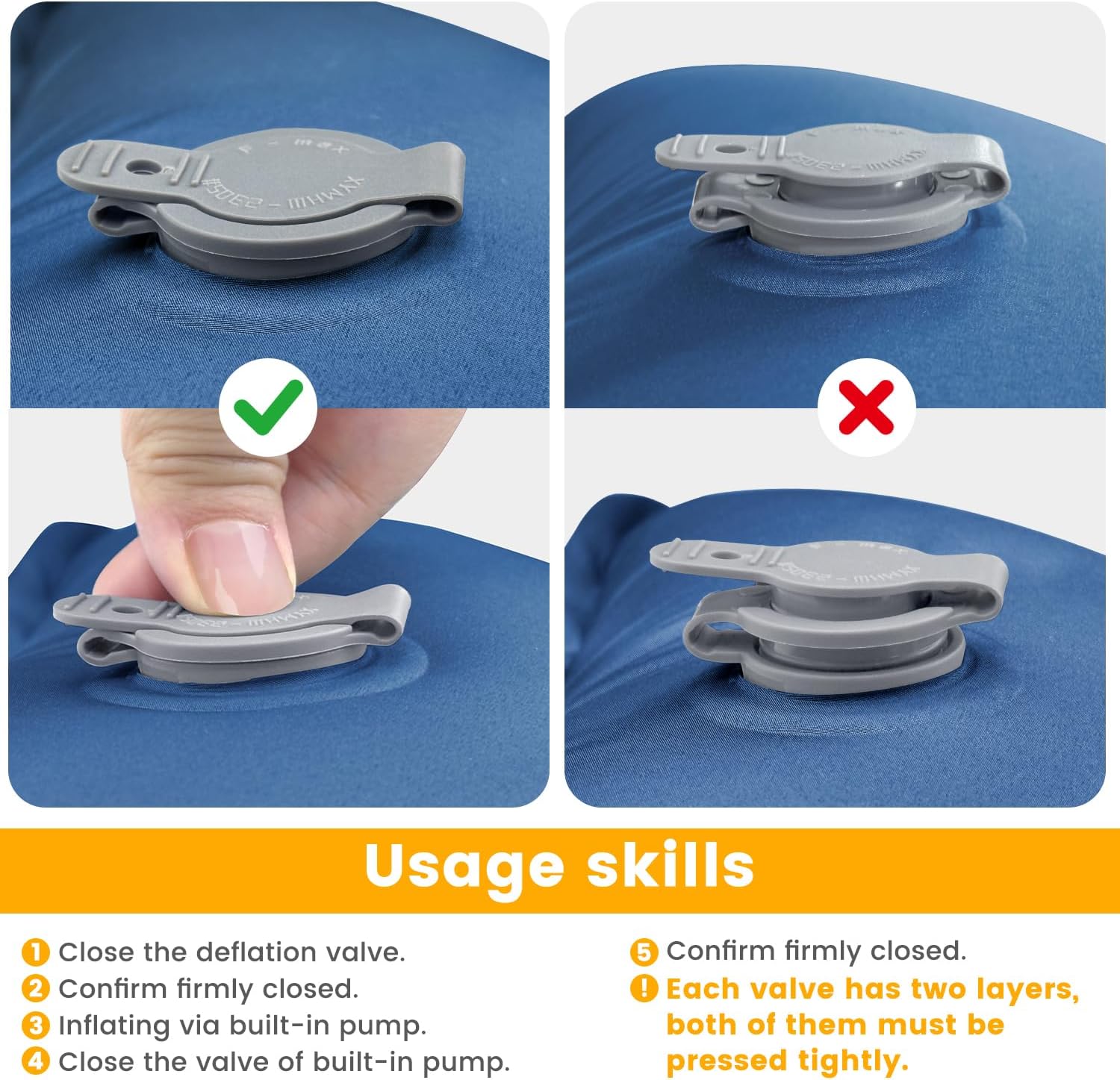 The sleep pad’s built-in pillow is soft and firm, and the pillow is inflated to a height of 6 inches to give enough neck support to be comfortable and suitable for side sleepers. Our camping sleeping mat stays inflated for long periods of time, with no leaks or need to pump during the day or night. It’s great for use on uneven terrain or paired with a camping bed, cot, sleeping bag and more. Why is it difficult for our outdoor camp pads to leak? Because our sleeping pads are specially designed to prevent air leakage. A layer of black gasket is added to the inside of the inflatable valve to prevent air from flowing backward when inflating.