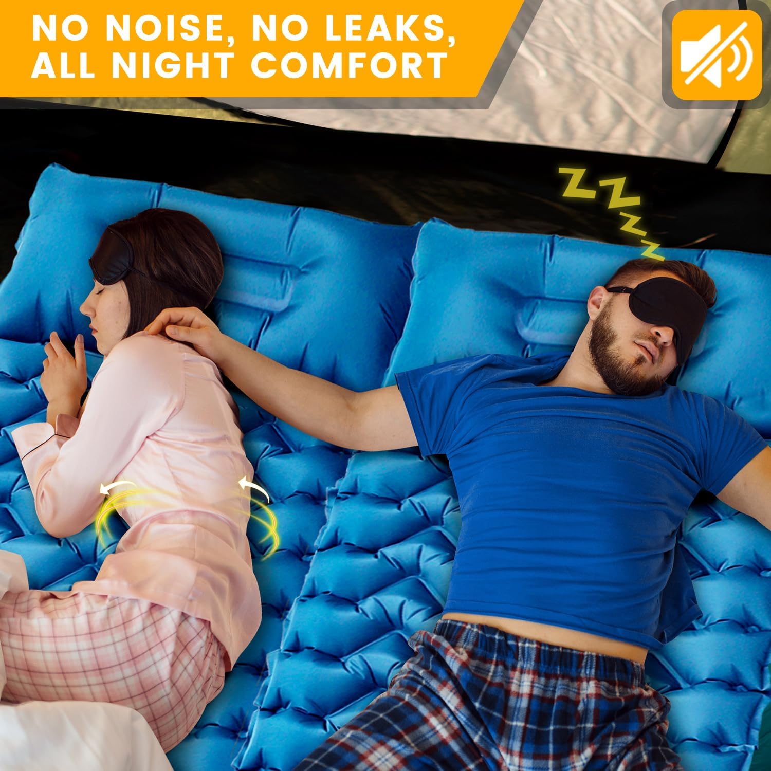 1. Ultimate Comfort Camp Pad: V-Shape Support + 4in Thick, Zero ground contact for side sleepers. A 4in thick air layer combined provides strong lifting force. Hips and shoulders stay completely suspended during side sleeping—no more pressure from hard ground. Quiet & non-slip surface ensures silent movement and undisturbed sleep. Camping sleep pad built-in pillow: contoured to support your neck curve, eliminating gaps between your head and shoulders. Holds up to 400 lbs for any body shape.