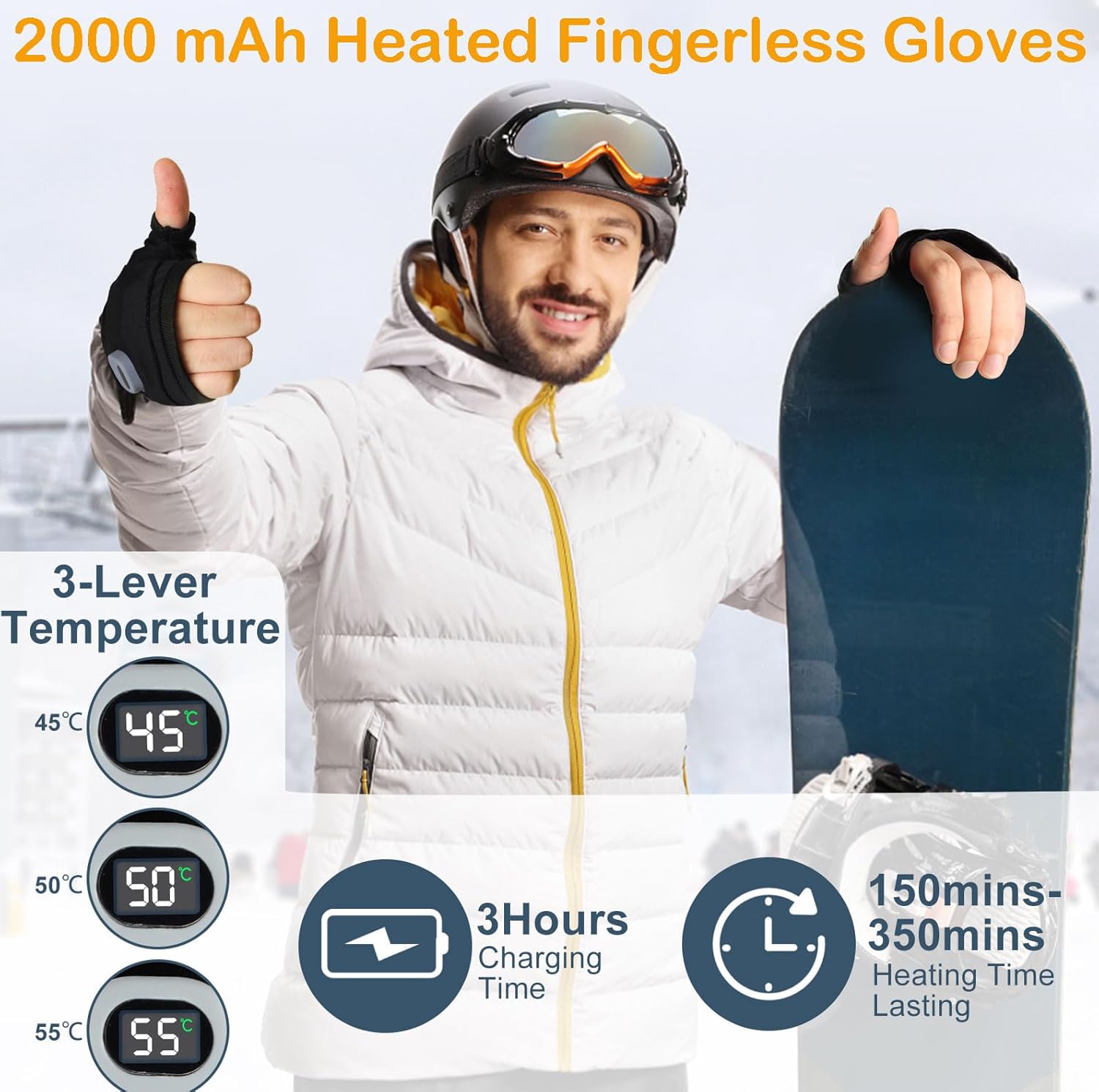 [ Convenient Fingerless Design] : Adjustable heating gloves have a fingerless design, allowing you to easily use smartphones and other devices without removing them. They also feature windproof closures and 360° heat distribution to ensure no cold spots on your palms.