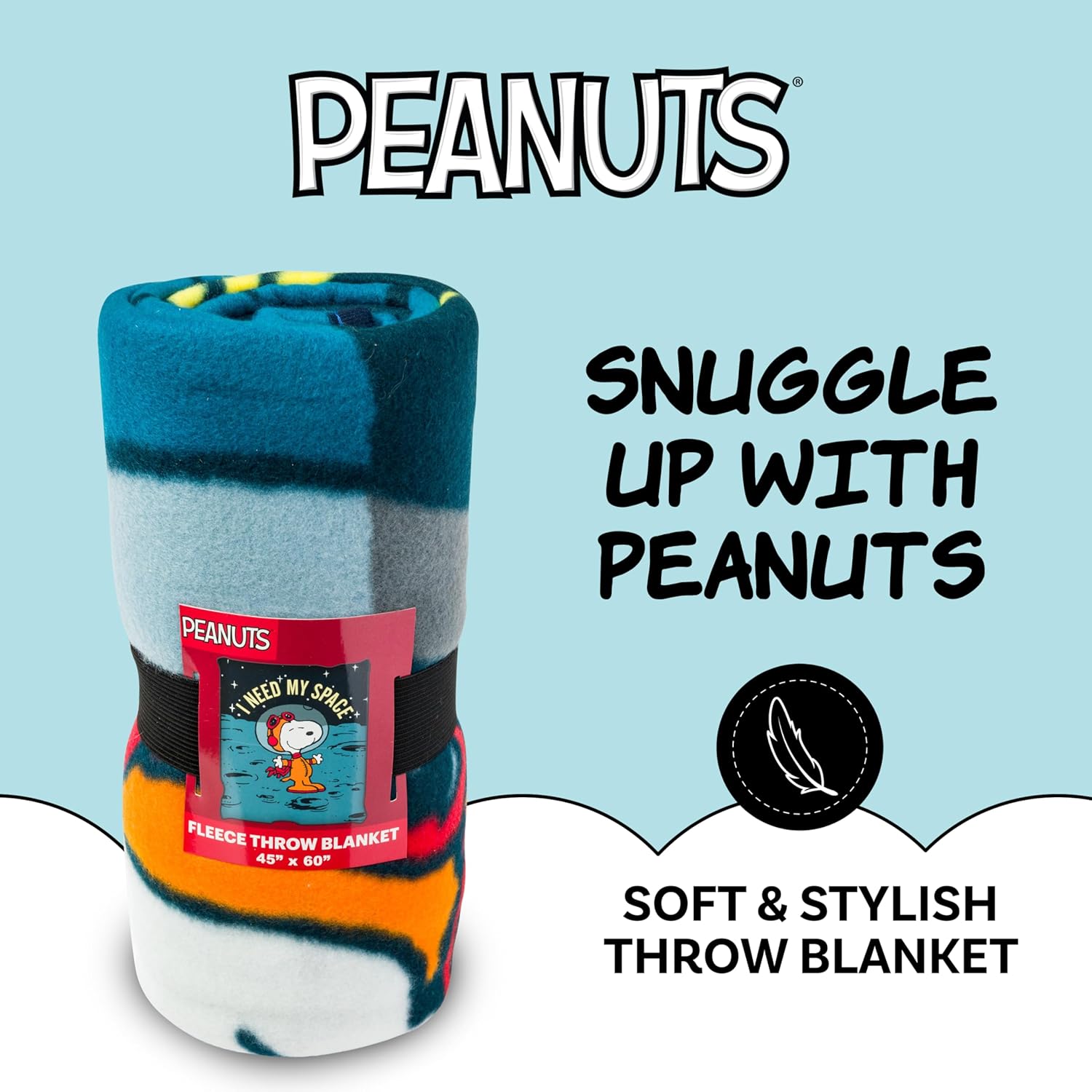 THROW BLANKET: Our throw blanket features Snoopy on the moon with the words “I need my space.” Throw Blanket, 45 x 60 inches. Super soft and cozy micro plush fleece is suitable for all seasons