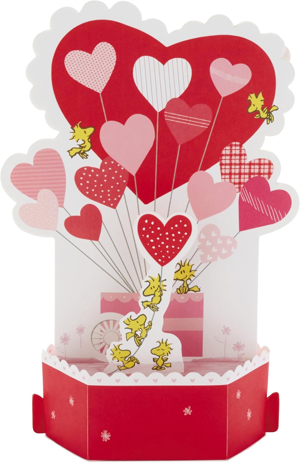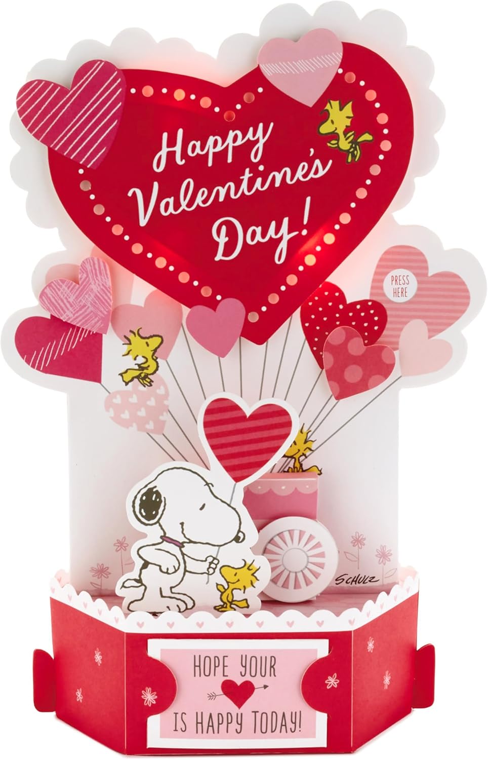 Musical pop up Valentine’s Day greeting card with light features Snoopy, Woodstock and friends with a cart full of heart-shaped balloons paired with a sweet message and a fun surprise: the hearts light up as the “Linus and Lucy” song plays.