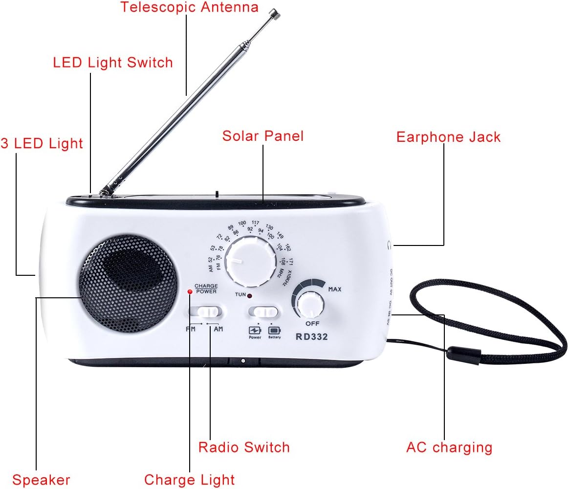 SOLAR RADIOS AND CRANK EMERGENCY RADIOS COMPATIBLE WITH FLASHLIGHT FUNCTION: Illuminate your surroundings with a solar powered flashlight and a 3-LED super bright flashlight seamlessly integrated with an FM/AM radio for entertainment. The solar powered flashlight adds to its comprehensive toolset for various scenarios