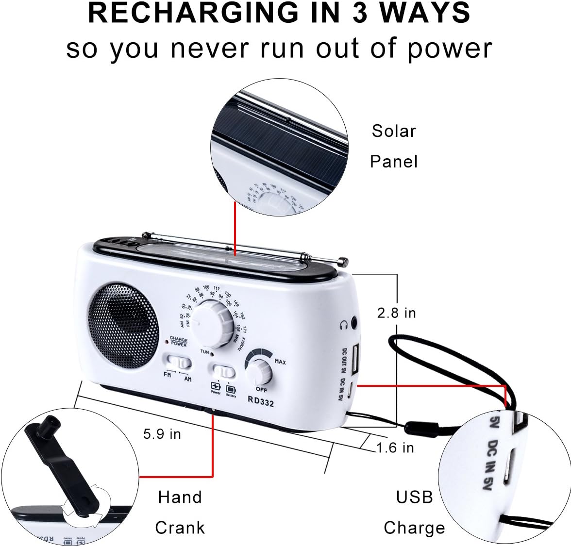 ROBUST AND VERSATILE POWER SOURCES: This emergency hand crank radio stands out with four reliable energy options: a dynamo generator, solar charging, a rechargeable 500mA battery, and compatibility with 3 x AAA batteries (not included). It excels as both a battery powered radio and a hand crank emergency crank radio