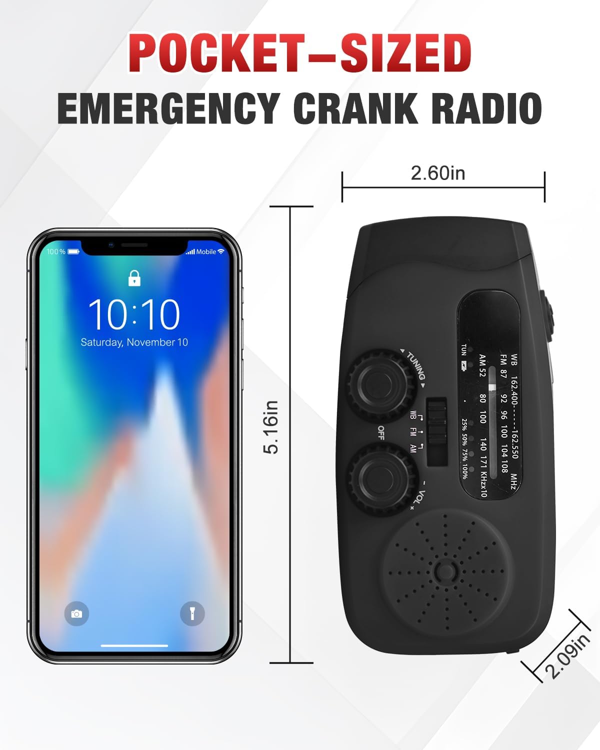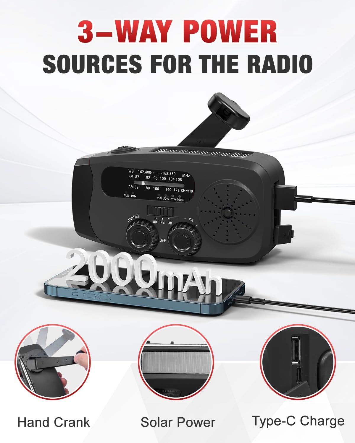 【 Pocket-sized Emergency Radio 】Measuring just 5.1* 2.1* 2.4 inches and weighing only 0.51LB, this hand crank emergency radio is exceptionally lightweight and portable. The crank radio features a built-in 2000mAh rechargeable battery, your devices like a phone can be charged via it during emergencies.