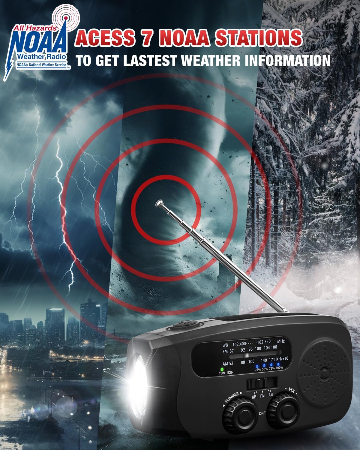 【 Access to AM/FM/NOAA Radio Stations 】This emergency hand crank radio pick up AM/FM bands enjoy your leisure time, and also access to NOAA weather broadcasts that report emergency weather information for your area and alert you to prepare in advance.