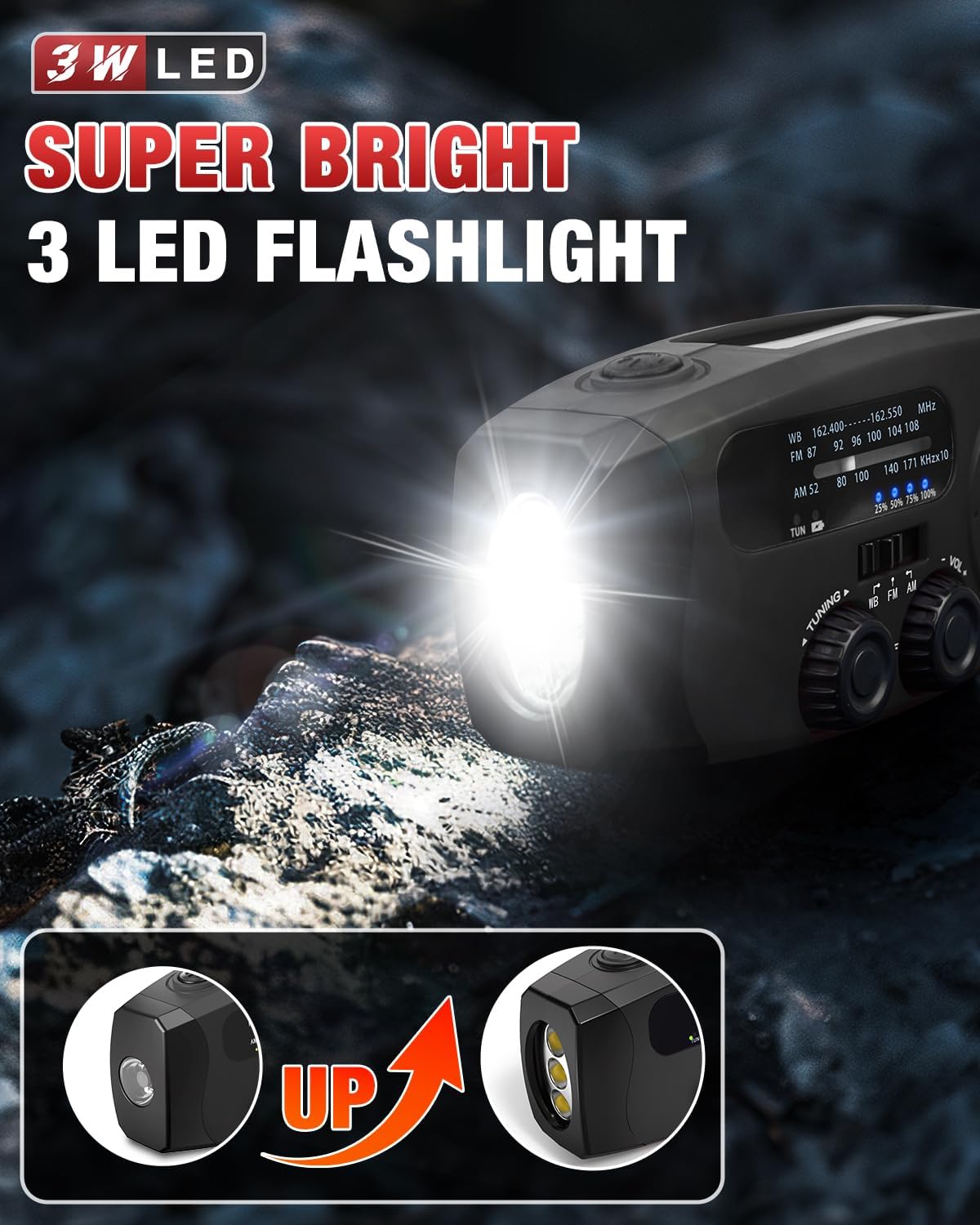 【 Super Bright 3 LED Flashlight 】 The flashlight on this emergency hand crank radio has been upgraded from a 1W single bead to a 3W 3 LED bead that provides 140LM of brightness, enough to provide you with emergency lighting in the event of a power outage.