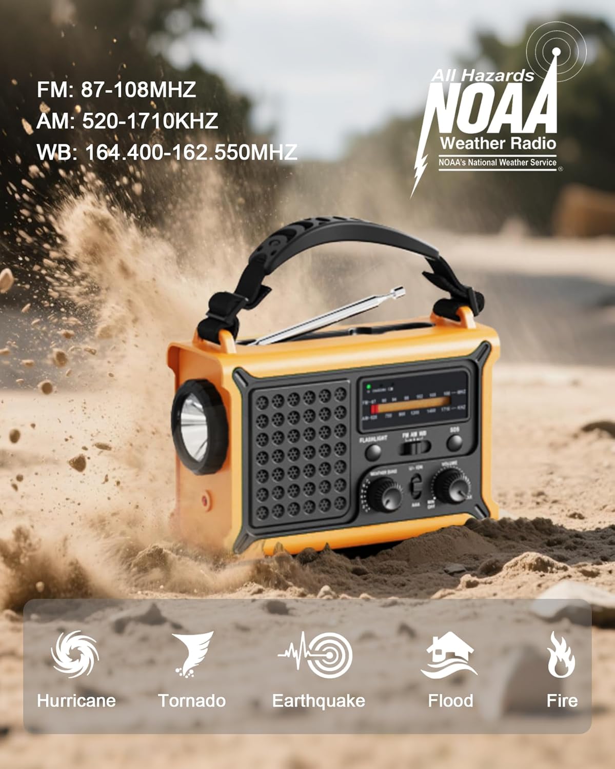 【Home & Outdoor Essential】This IPX6 waterproof weather radio keeps you powered, informed, and heard—with 5 ways to charge, NOAA alerts, and a loud SOS alarm. Compact, durable, and reliable—perfect for both emergency preparedness and outdoor adventures.