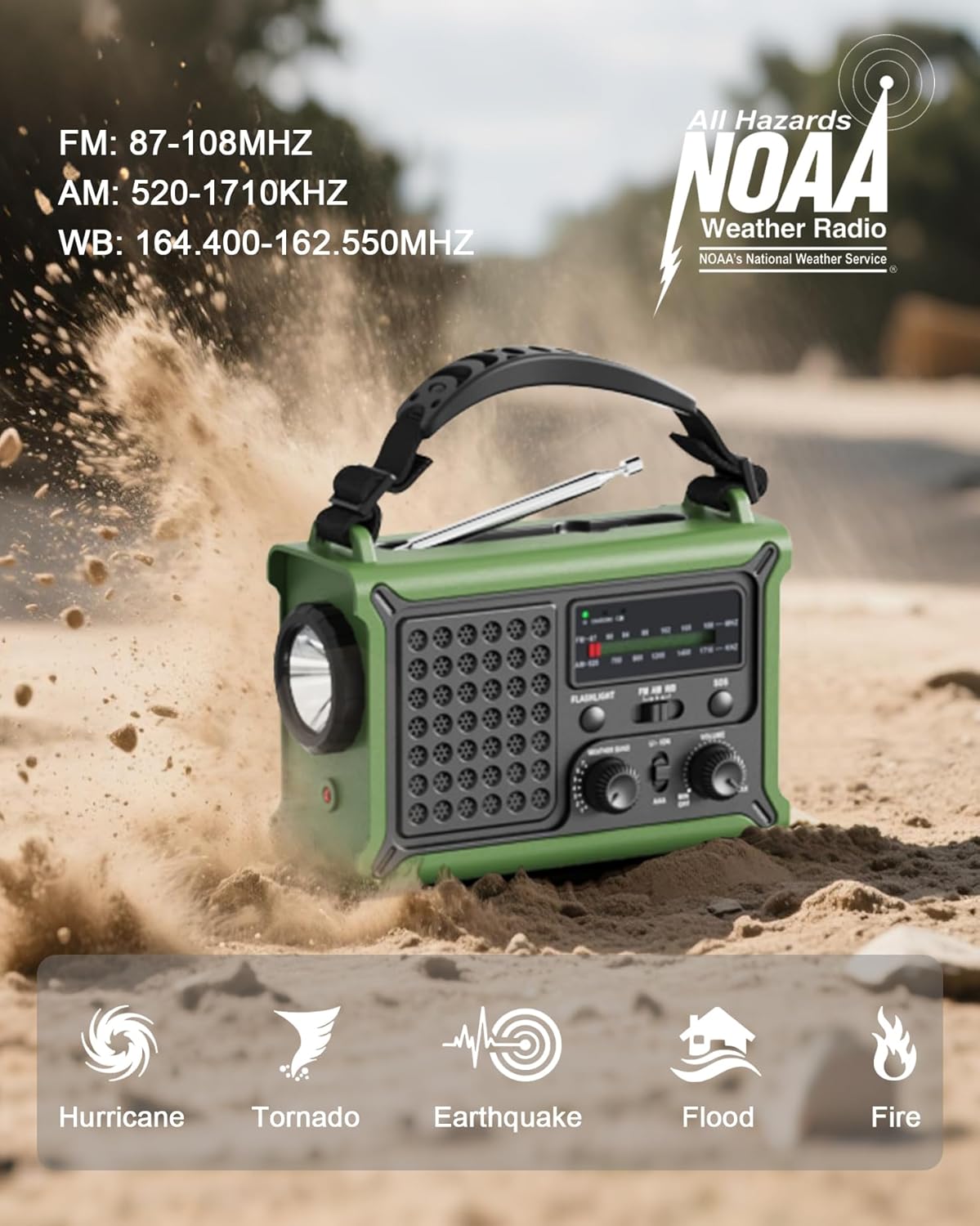 【Home & Outdoor Essential】This IPX6 waterproof weather radio keeps you powered, informed, and heard—with 5 ways to charge, NOAA alerts, and a loud SOS alarm. Compact, durable, and reliable—perfect for both emergency preparedness and outdoor adventures.