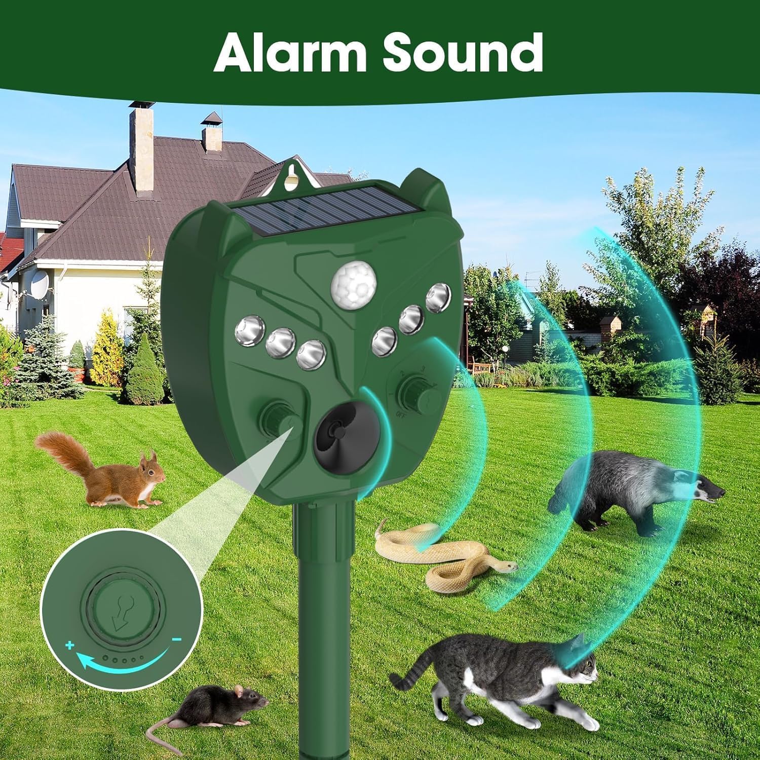π± Smart PIR Detector, Pinpoint Response: Thanks to the PIR motion sensor,it only detects approaching creatures, so it does not work randomly; both effective and energy efficient. This repeller device uses an advanced PIR motion detection system to identify movement, triggering powerful ultrasonic waves,a loud alarm,and flashing strong red and white LED strobe light. Great for Repelling Deer, Rabbits, Gophers, Voles, Moles, Groundhogs,Chipmunks,Racoons,Squirrels,Stray dogs,cats,wild boar,ferret.