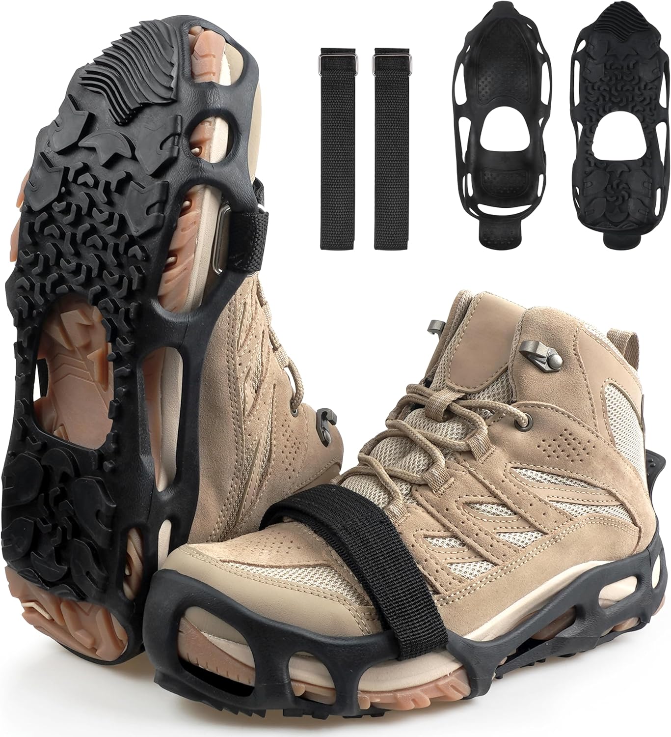 SIZES AVAILABLE: Spikeless traction cleats fit for men and women, available in two sizes to fit most shoes and boots: S/M (US: 5.5-8 UK:3.5-7), L/XL (US: 9-12 UK:9-11);Slip-on design fits snugly over boots and shoes. Attached adjustable straps provide quick adjustment and more stable