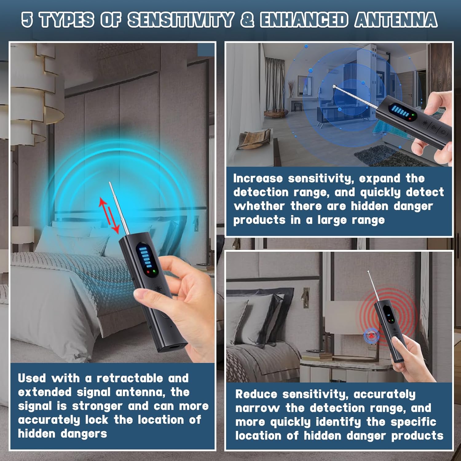 Multiple Detection Types: This hidden bug and camera detector is equipped with an antenna to expand the detection range and enhance the anti-interference ability. 5 detection signal sensitivities can find the spy signal source more accurately and quickly in a large environment. 3 types of infrared light flashing, red light always on, red light slow flashing, red light fast flashing, can more easily find hidden cameras in the environment