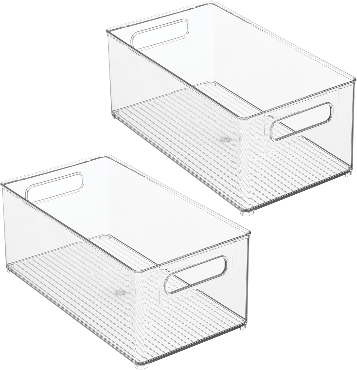 SMART STORAGE – The iDesign Plastic Fridge Bin corrals kitchen essentials in modern style; Its transparent construction offers unobstructed views of food items, and its open-top design allows for easy accessibility, simplifying item location and retrieval; From cabinets to countertops, the crystal-clear construction brings a hint of luxury to your daily routine while keeping clutter under control by conveniently storing an assortment of kitchen or pantry essentials; Set of 2