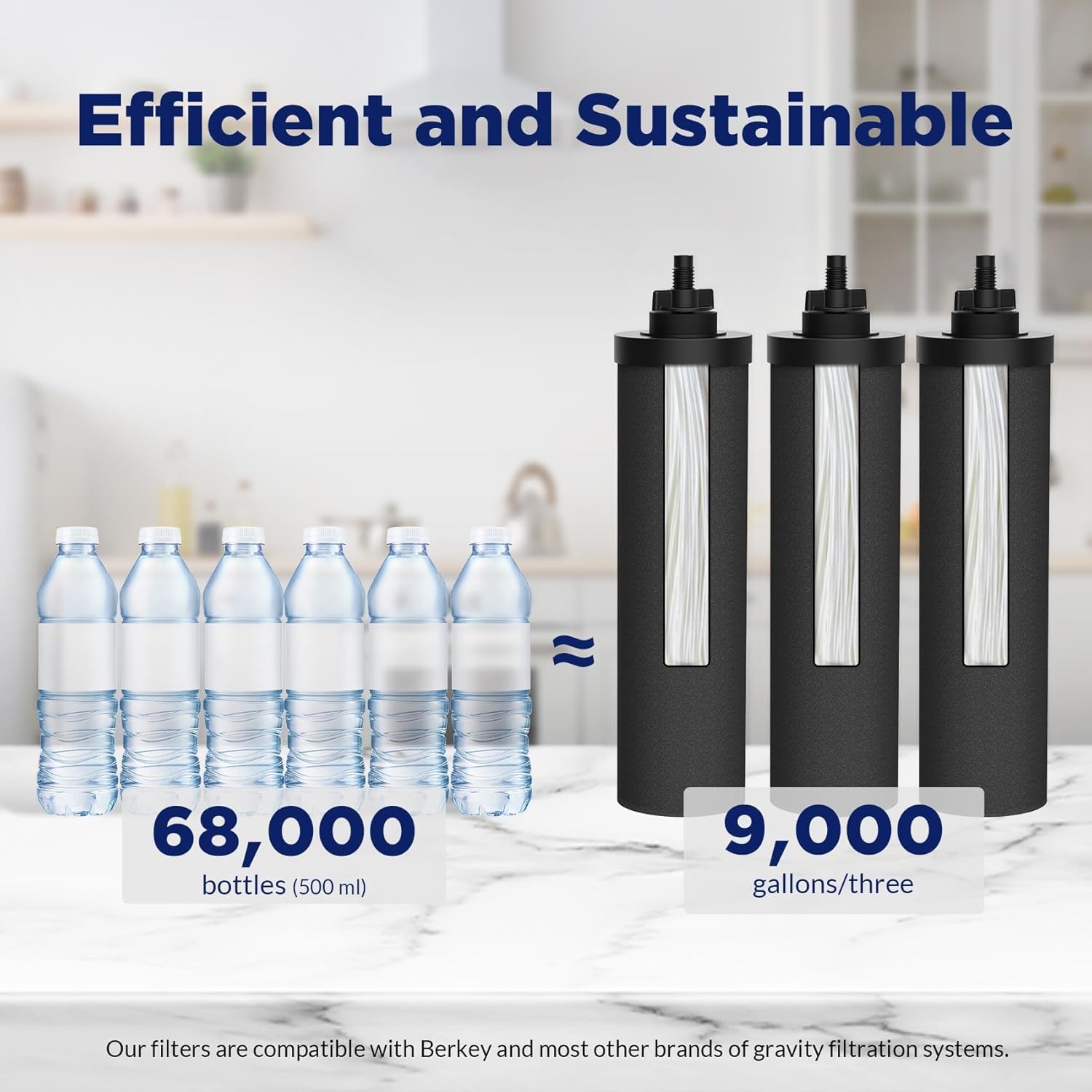 Efficient and Sustainable: Gravity water filter system with a capacity of 2.25 gallons, three filters can produce water at the same time. Enjoy a flow rate 1.5 times faster than systems featuring only two filters. It comes with 3 elements, effectively treating up to 9,000 gallons of water, ensuring over 3 years of service for a family of four, saving you up to 68,000 plastic bottles (500ml).