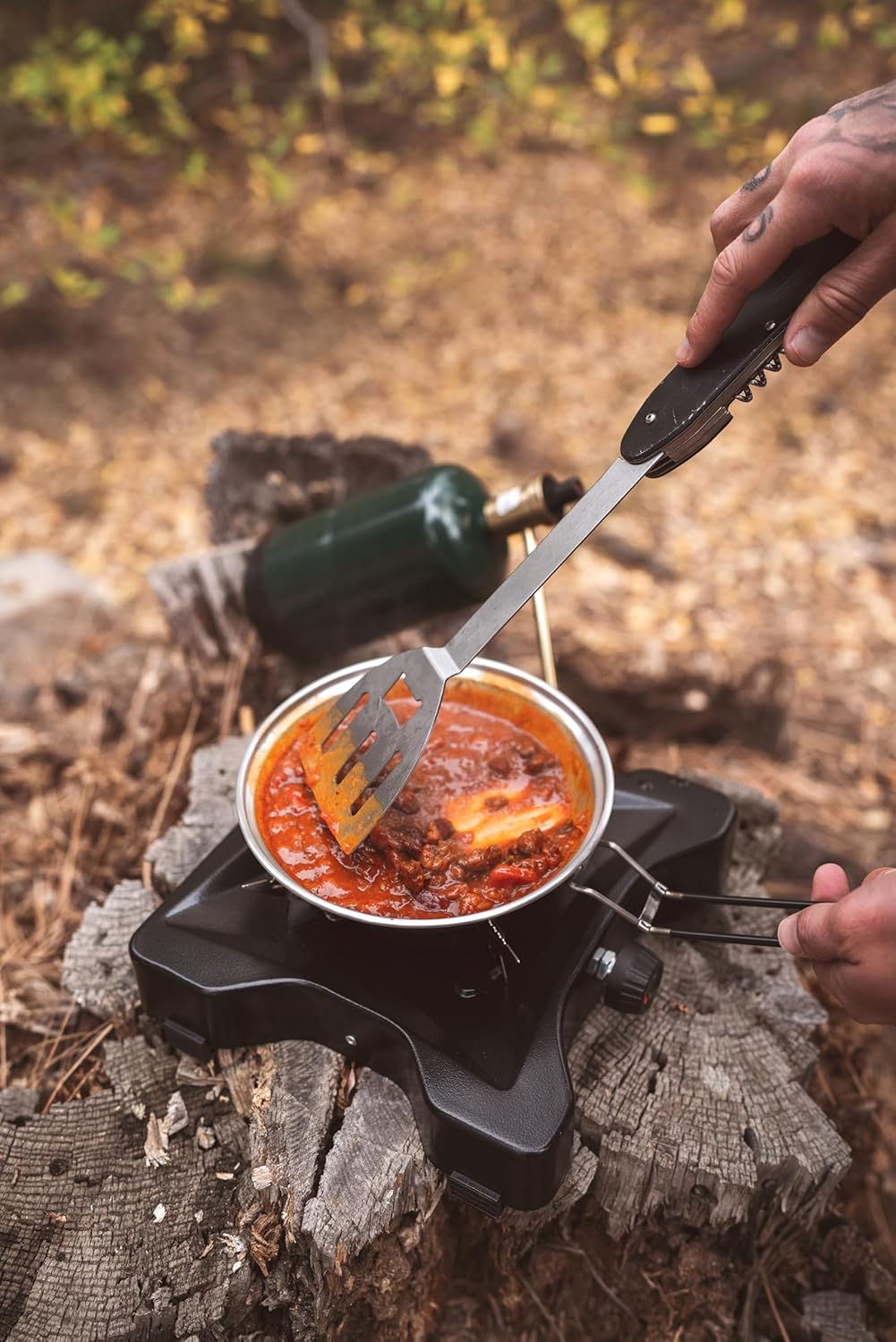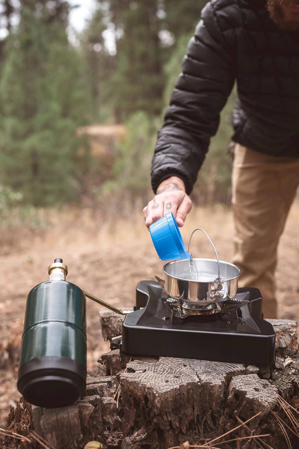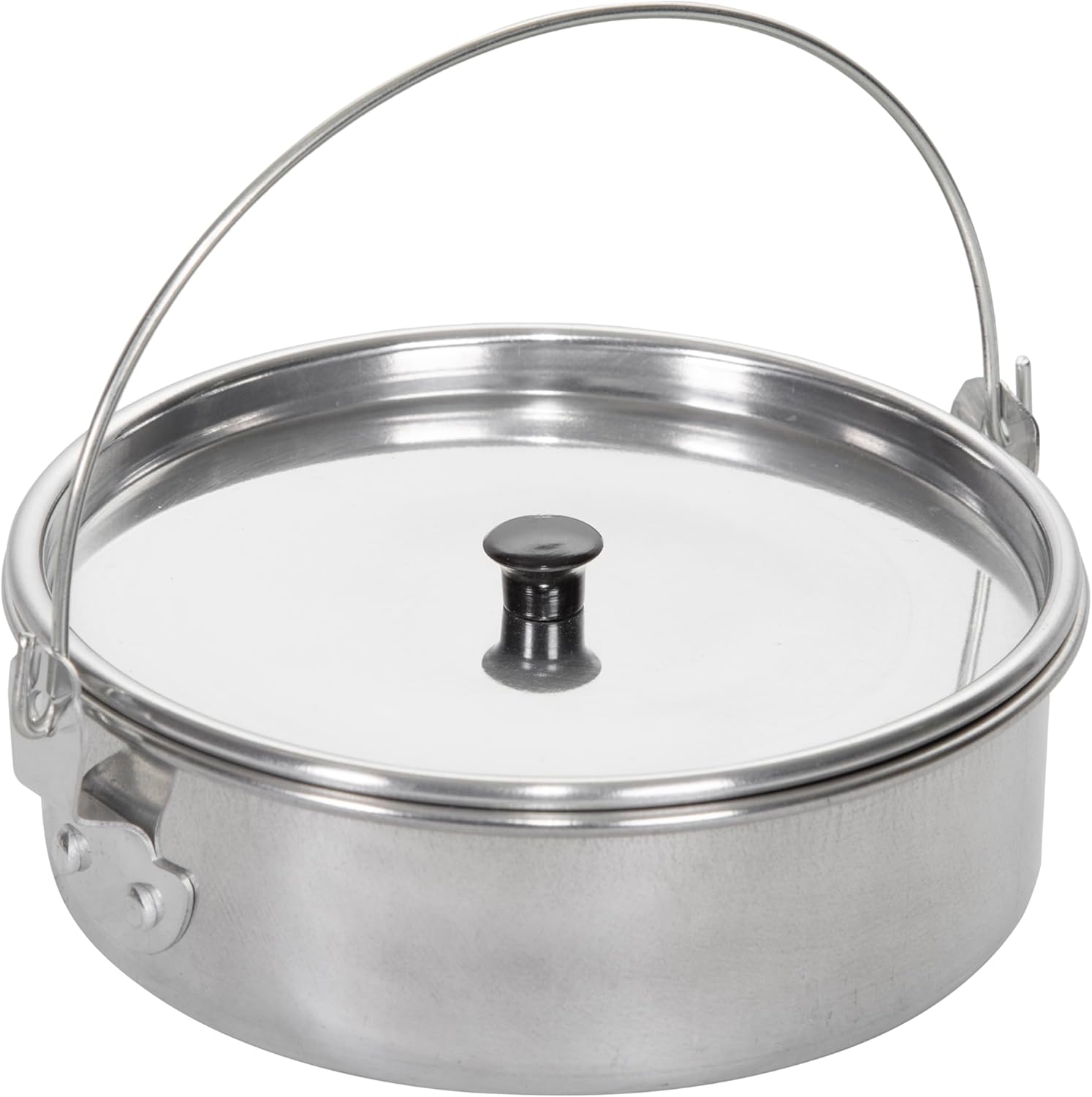 Includes: fry pan with PVC coated stay cool wire grip handle, plate, pot with lid and plastic cup