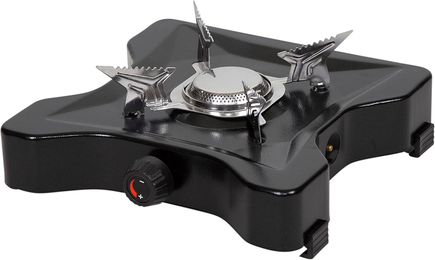 Detachable burner grate and brass regulator arm nest underneath for compact storage and travel