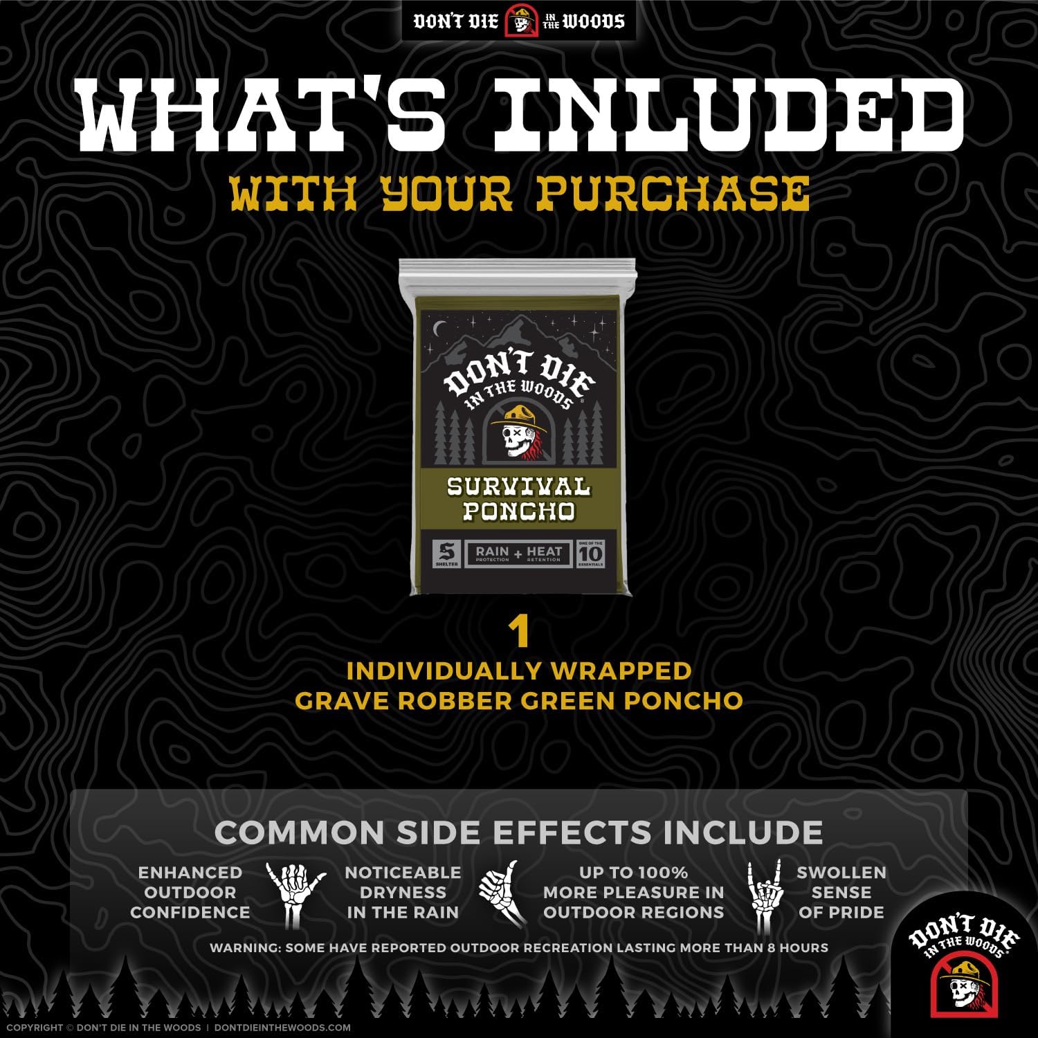 NOT DYING IN THE WOODS – Duh. Otherwise we wouldn’t be selling it, right? Keep some in your backpack, car, and emergency kits just in case. Besides keeping you warm and dry, this mylar poncho has countless uses in survival situations.