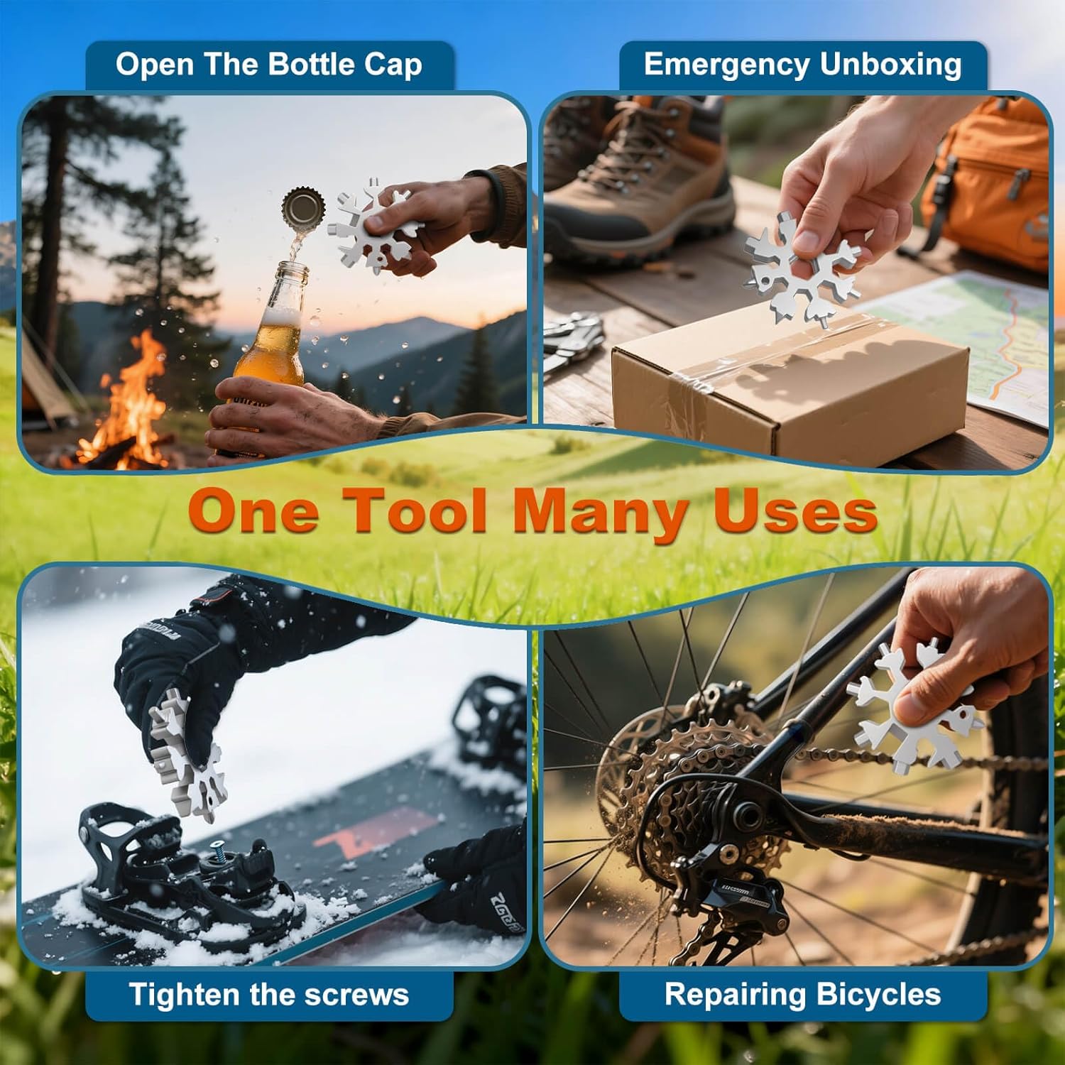 【Wrench Kit】 With 18 different functions in one compact tool, this snowflake multitool is like having a complete wrench kit in the palm of your hand.