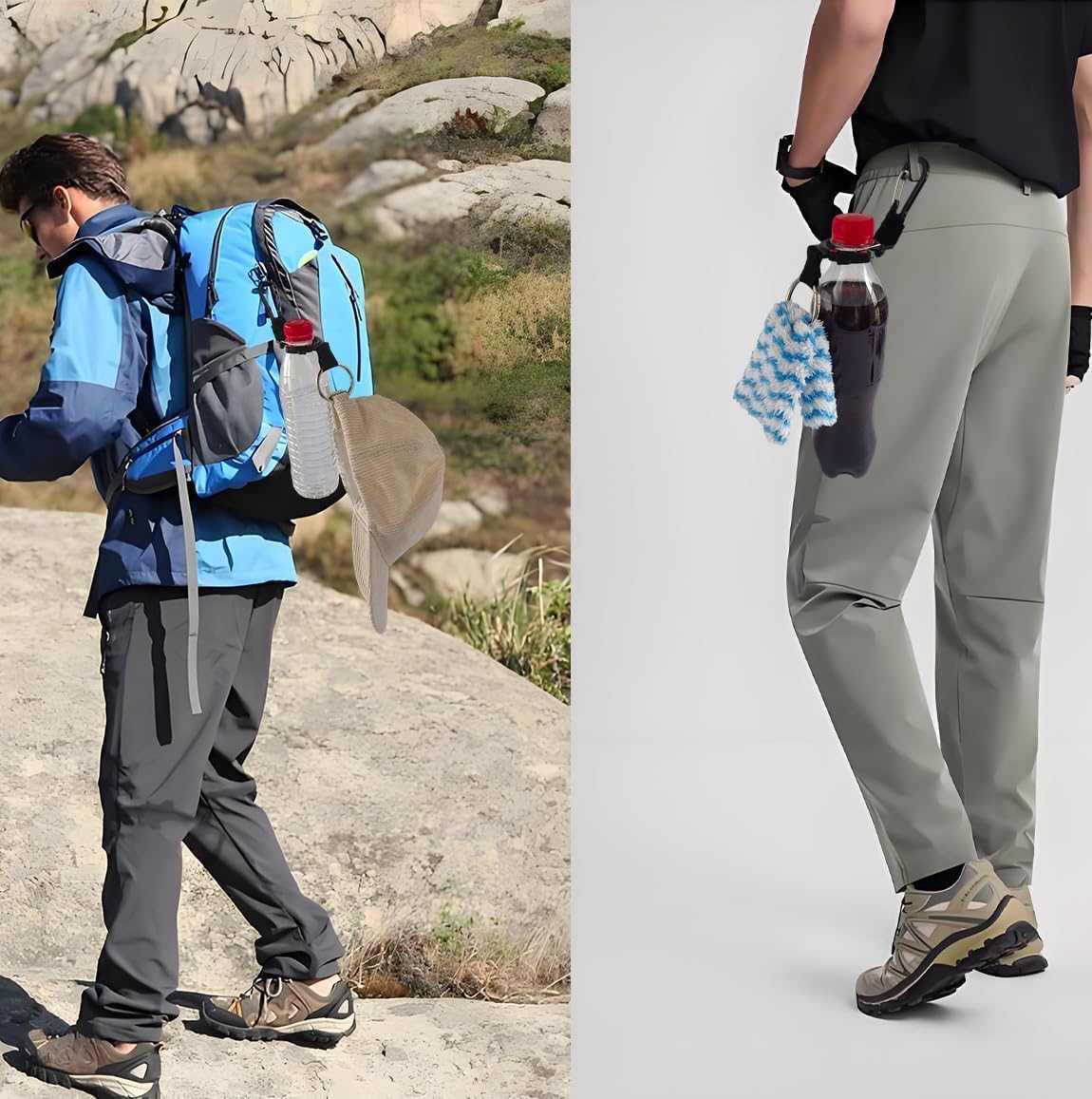 【Tool-free Installation】Simply insert the bottle mouth into the holder opening snap it into place, then clip the carabiner onto your backpack or belt. Safety warning: If the clip feels too tight, switch to a looser groove instead of forcing it (Preventing plastic breakage)