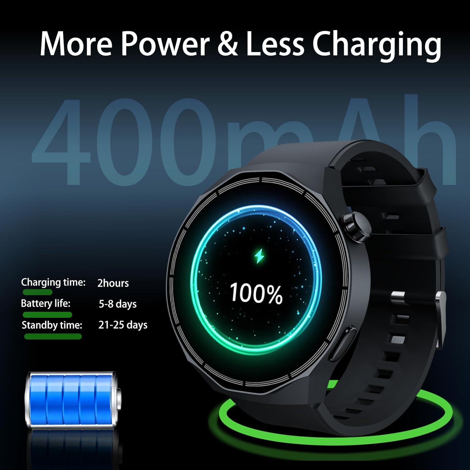 【Smart & Long-Lasting 】: Supports message reminder and Bluetooth calling, with AI assistant for a smoother experience. The 400mAh battery paired with the intelligent coordination system will provide 5-7 days of battery life with just a 2 hours charge.