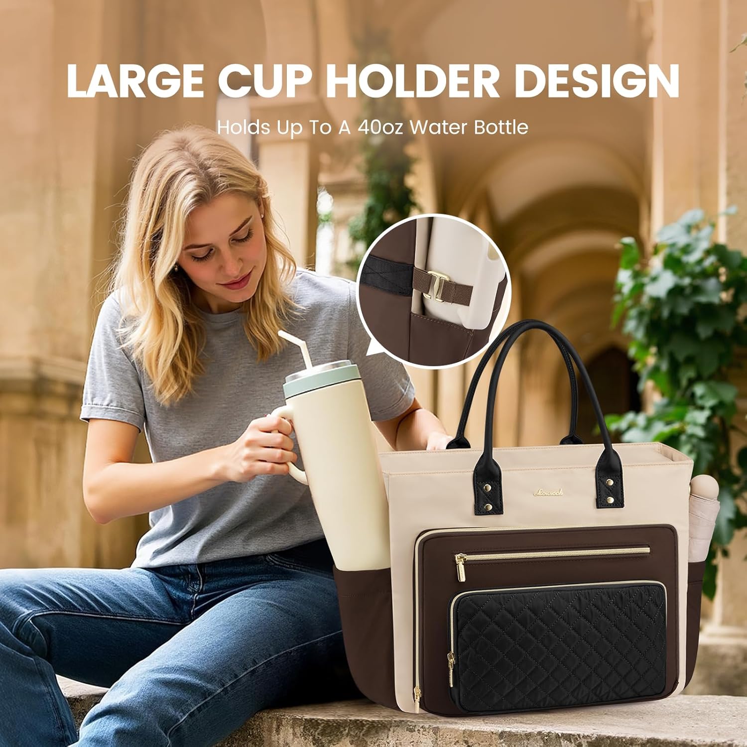 With Large Cup Holder: Designed for your large water bottle, our laptop tote bag features an elastic side pocket that holds up to 36oz. The innovative design allows the cup’s handle to fit perfectly, ensuring stability and easy access. This dedicated side pocket is ideal for those always on the go, combining style with functionality. Ideal for professionals, travelers alike.