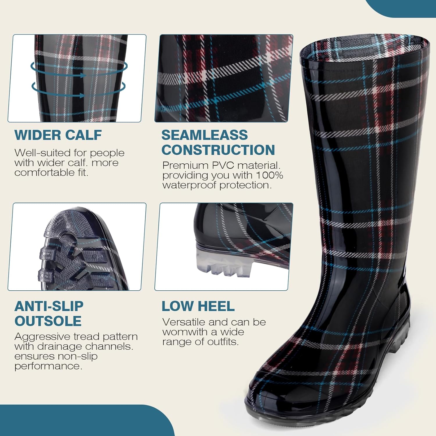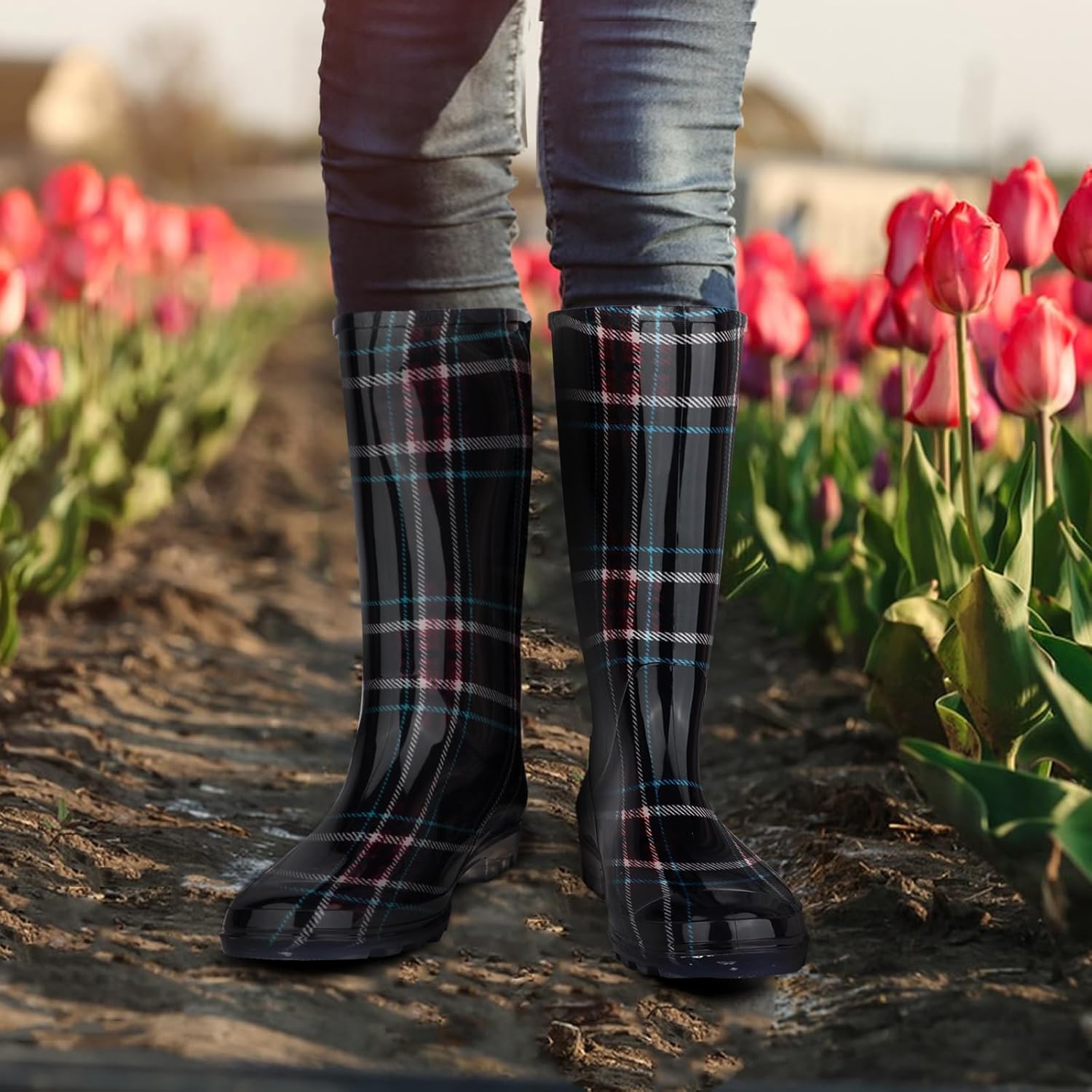 The video showcases the product in use.The video guides you through product setup.The video compares multiple products.The video shows the product being unpacked. DaeRainy Tall Rain Boots for Women Merchant Video