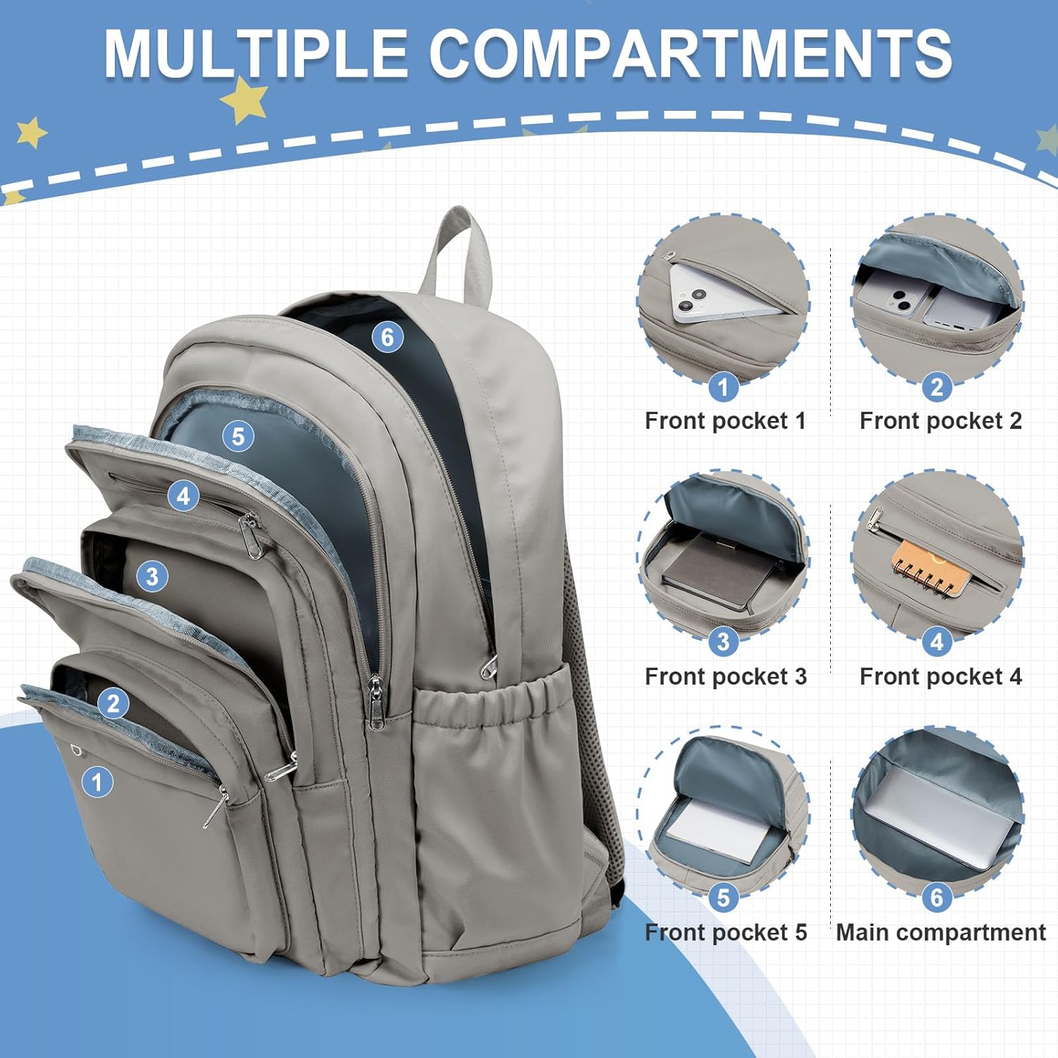 【Large Capacity & Multiple Compartments】This multifunctional schoolbag has a large-capacity main compartment and thoughtfully designed 10+ independent functional areas, including a front zipper pocket, a side elastic net pocket and an internal secret compartment, which can easily classify and store 15.6-inch laptops, stationery, power banks and other personal items. It can meet your needs for school, travel, office and daily life