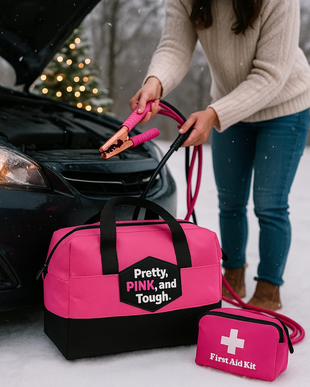ALL THE ESSENTIAL ACCESSORIES FOR ROADSIDE EMERGENCIES – This pink roadside emergency set is packed with all the basic must-haves every woman should carry in her car. It holds a 12 ft set of black and pink booster cables and first aid kit, as well as a pink hand crank emergency flashlight, multi tool, tire gauge, emergency hammer, whistle with compass, ice scraper, and How to Jump Start Your Car Instruction card.