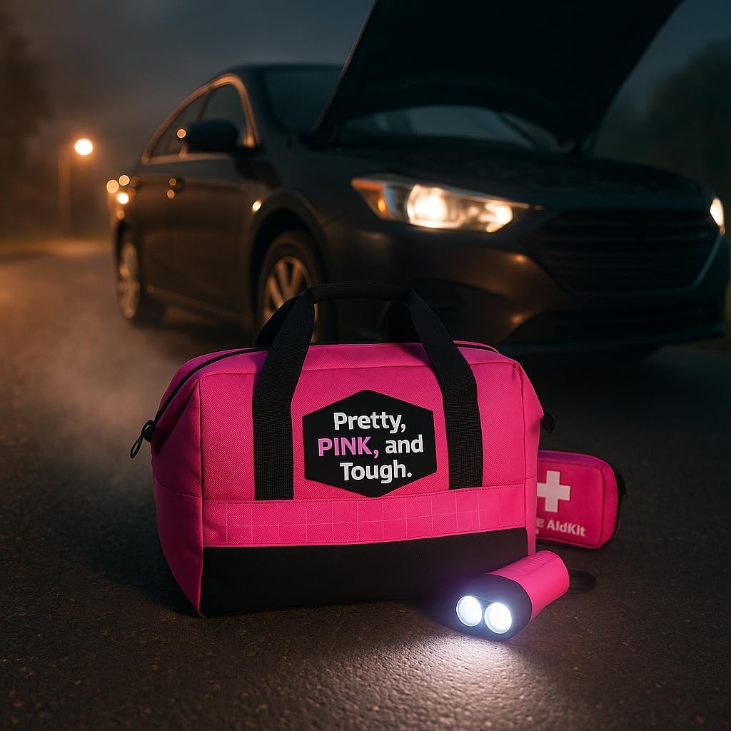 IT’S ALL STARTS WITH A GREAT BAG – A standard roadside kit remains in a car for years on end, being bumped, squished, and moved around all the time, so a quality carry bag is an absolute necessity. This sturdy, soft-sided, black and pink tool bag is just what your daughter, girlfriend, wife, or mother needs to keep her important safety kit together for the long haul. It also features a wide reflective strip to increase visibility for other drivers.