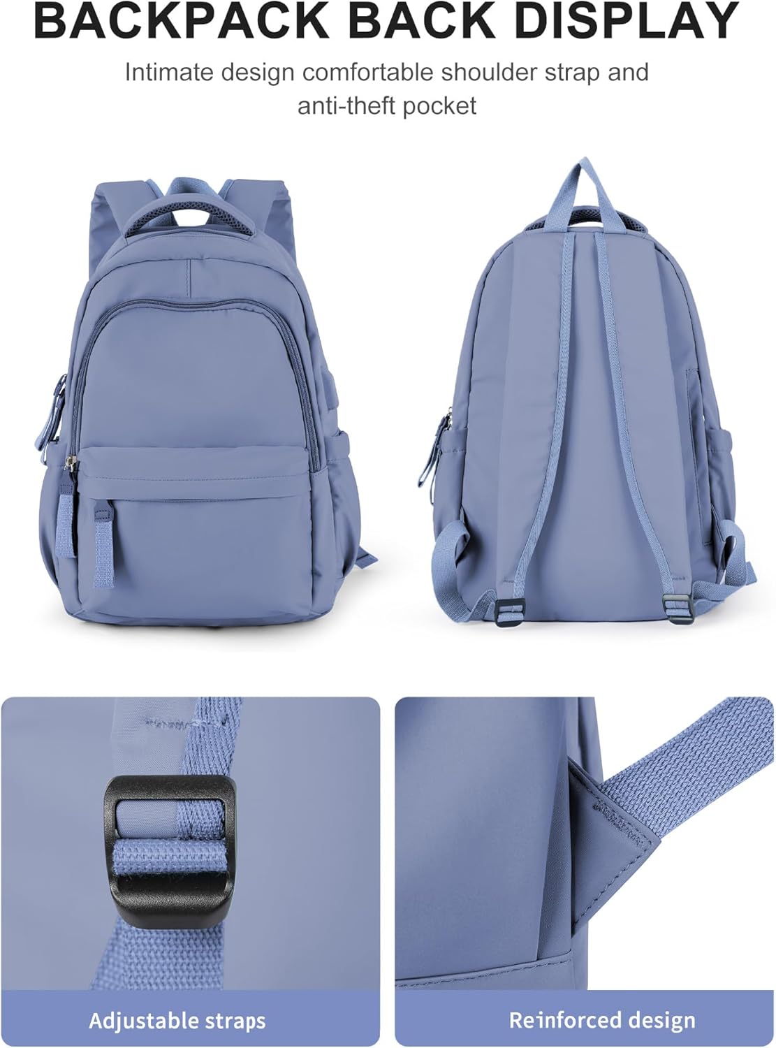 【Large capacity lightweight backpack with multiple pockets】 This lightweight bookbag has two compartments, two side pockets, a front pocket, and an anti-theft pocket that can hold 8 to 20 books or magazines, headphones, water glasses, umbrellas, and other items. The main compartment also has multi-functional pockets that can store different items such as mobile phones, power banks, tablets, and bus passes.