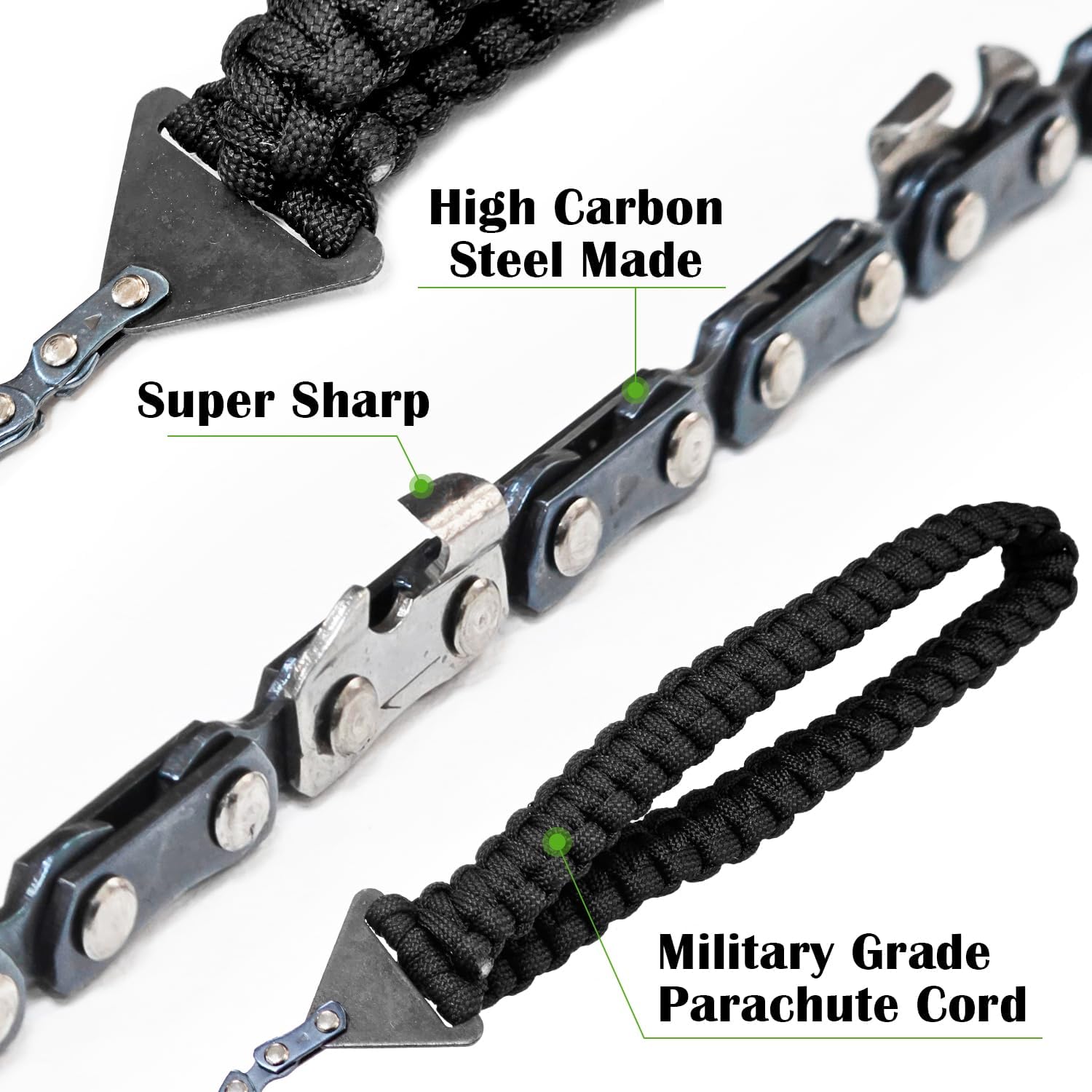 Pocket Chain Saw: The 40in- long pocket chain saw is made of high-quality steel with sharp teeth on both sides for cutting wood in camping, hiking and other survival situations